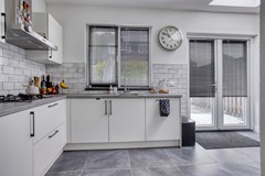 Aan de achterzijde grenst over de gehele breedte de moderne woonkeuken met donkere tegelvloer, openslaande tuindeuren en een L-vormig interieur. Dit interieur bestaat onder meer uit diverse kastjes en laden, een RVS spoelbak en als inbouwapparatuur een koelkast, vaatwasser, combioven/magnetron en een 5-pits gaskookplaat waarboven een RVS afzuigkap; allen van het merk Etna. Boven het werkblad ter hoogte van de spoelbak is een raampartij voorzien waardoor je een fijn zicht hebt op de tuin. Dit raam zorgt tezamen met de openslaande tuindeuren als de lichtkoepel voor een prettig lichtinval ter plaatse.