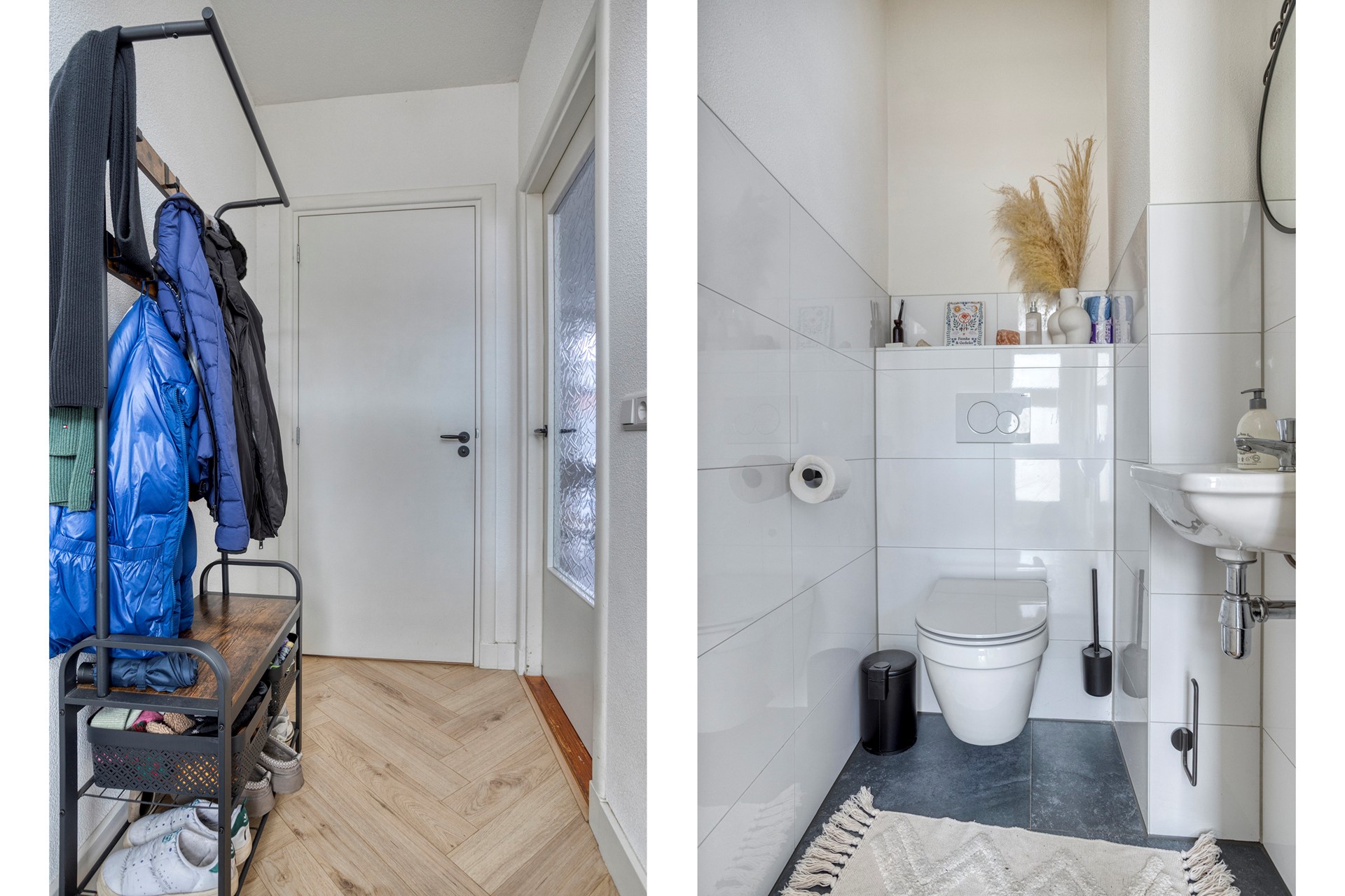 Entree: Via de entree betreedt je de hal met fraaie visgraat vloer, meterkast en deels betegelde toiletruimte voorzien van wandcloset en fonteintje.