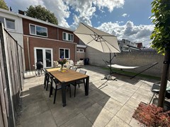 Achter de woning is een geheel omsloten en volledig betegelde tuin met achterom aanwezig. De tuin is op het noordwesten gesitueerd en is voorzien van houten schuttingen. De garage, voorzien van water en elektra, is middels openslaande deuren vanuit de tuin toegankelijk; vanaf de straat via een stalen kanteldeur.