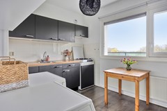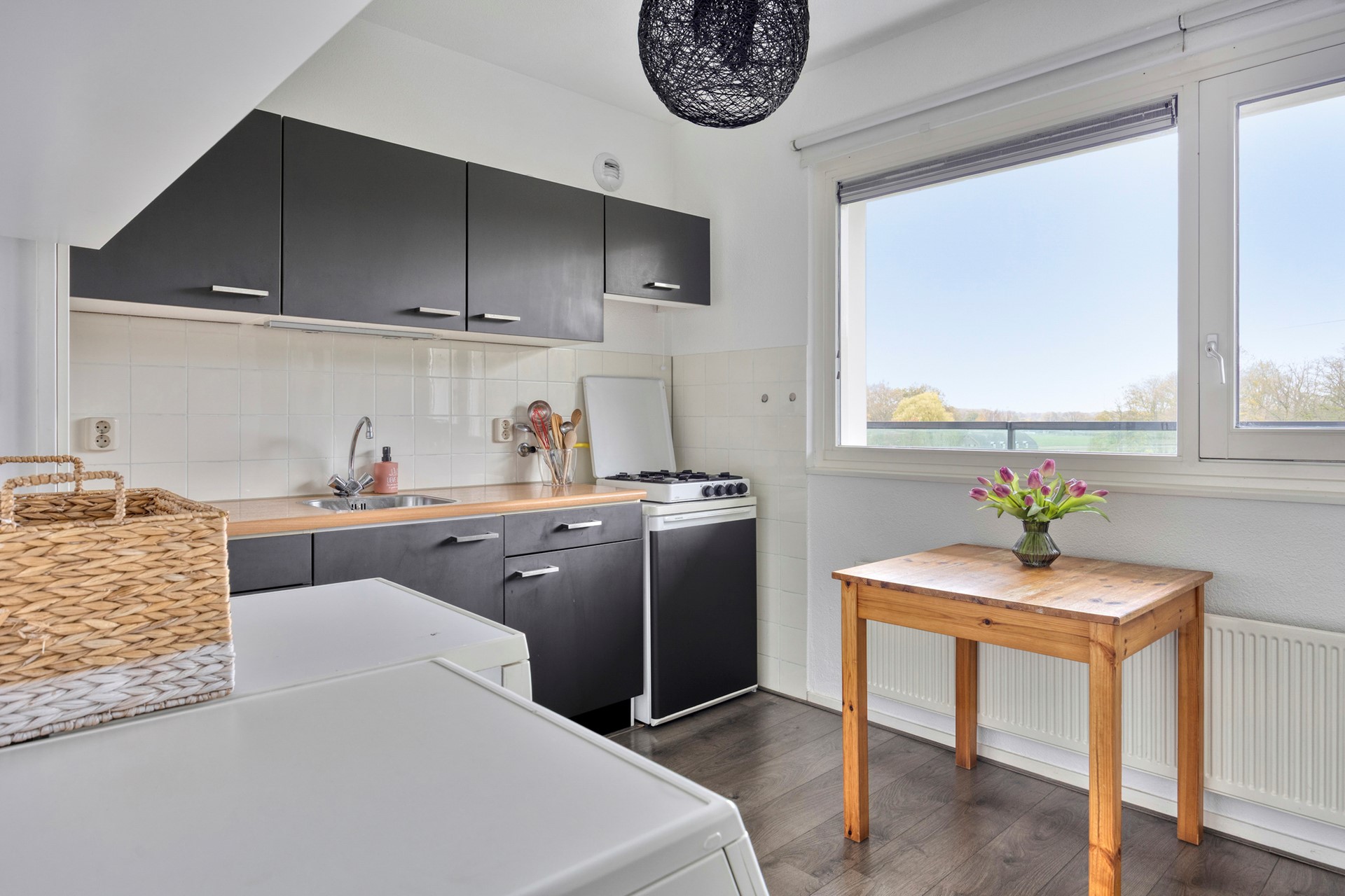 De keuken is praktisch en compleet ingericht met een 4-pits gaskookplaat, losse koelkast en een handige wasmachineaansluiting. Een functionele ruimte waar u gemakkelijk kunt koken, wassen en organiseren ideaal voor dagelijks gemak.