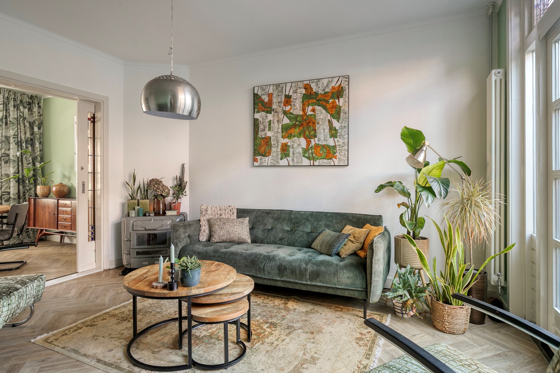 De woonkamer-en-suite is een absolute parel. De originele en-suite deuren met glas-in-lood zorgen voor een prachtige lichtinval en maken het mogelijk om de ruimte te verdelen in een sfeervolle eetkamer aan de voorzijde en een comfortabele zitkamer aan de achterzijde. De houtlook PVC vloer in visgraatmotief voegt warmte en luxe toe, terwijl het vrije uitzicht over het plantsoen aan de voorzijde iedere dag opnieuw inspireert. Aan de achterzijde openen de tuindeuren zich naar de tuin – een naadloze overgang tussen binnen en buiten.