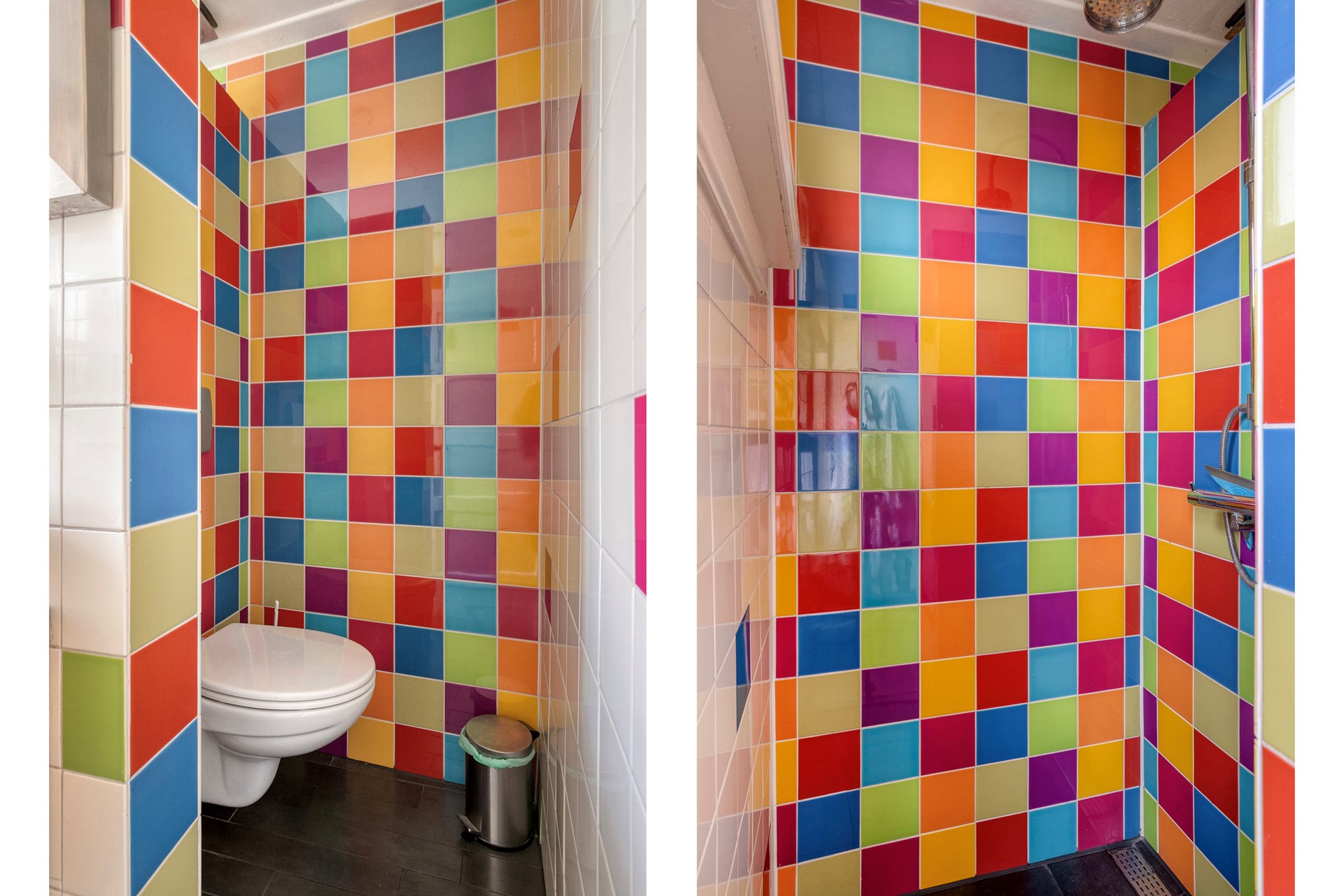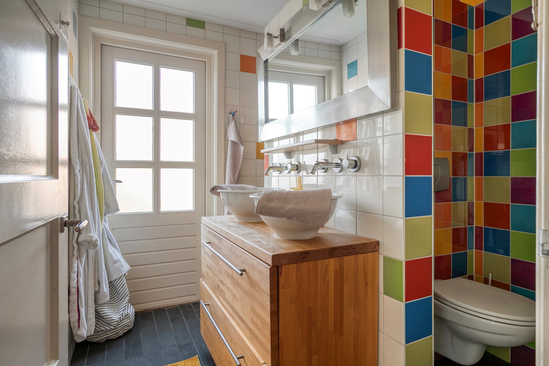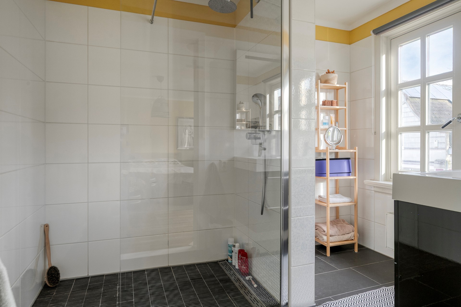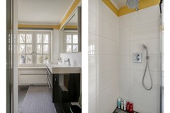Daarnaast is er nog een tweede badkamer op deze verdieping – een luxe die je zelden ziet in een jaren ’30 woning. Met vloerverwarming, kleurrijke tegels, een dubbele wastafel, toilet en een douche met regenstort is dit een fijne, frisse ruimte. Vanuit hier heb je toegang tot het platte dak.