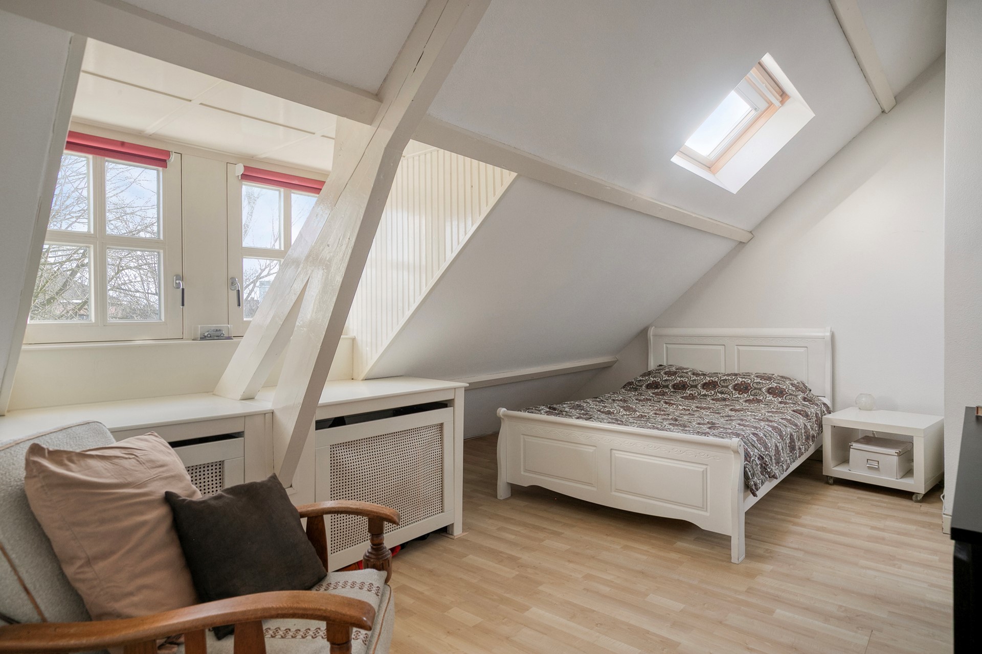 De zolderverdieping verrast. Via de vaste trap bereik je de voorzolder en twee ruime slaapkamers, ideaal als kinder-, werk- of hobbykamers. De zichtbare houten spanten zorgen voor een warme, authentieke sfeer. Extra bergruimte vind je op de vliering.