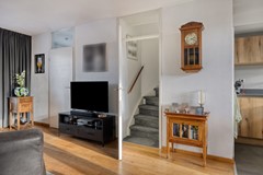 De entree geeft toegang tot het moderne hangende toilet met fonteintje, de meterkast en de verdeler van de stadsverwarming. Vanuit hier loop je direct de woonkamer en keuken in. De vaste trap, centraal geplaatst in de woonkamer, verbindt op natuurlijke wijze alle verdiepingen met elkaar.