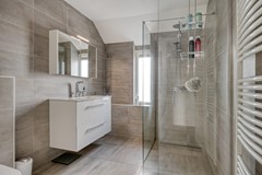 Op de eerste verdieping bevinden zich drie comfortabele slaapkamers en een moderne badkamer. De badkamer, circa 8 jaar oud, is volledig betegeld en uitgerust met een inloopdouche, toilet, wastafelmeubel en radiator — een fijne plek om de dag rustig te beginnen of ontspannen af te sluiten.