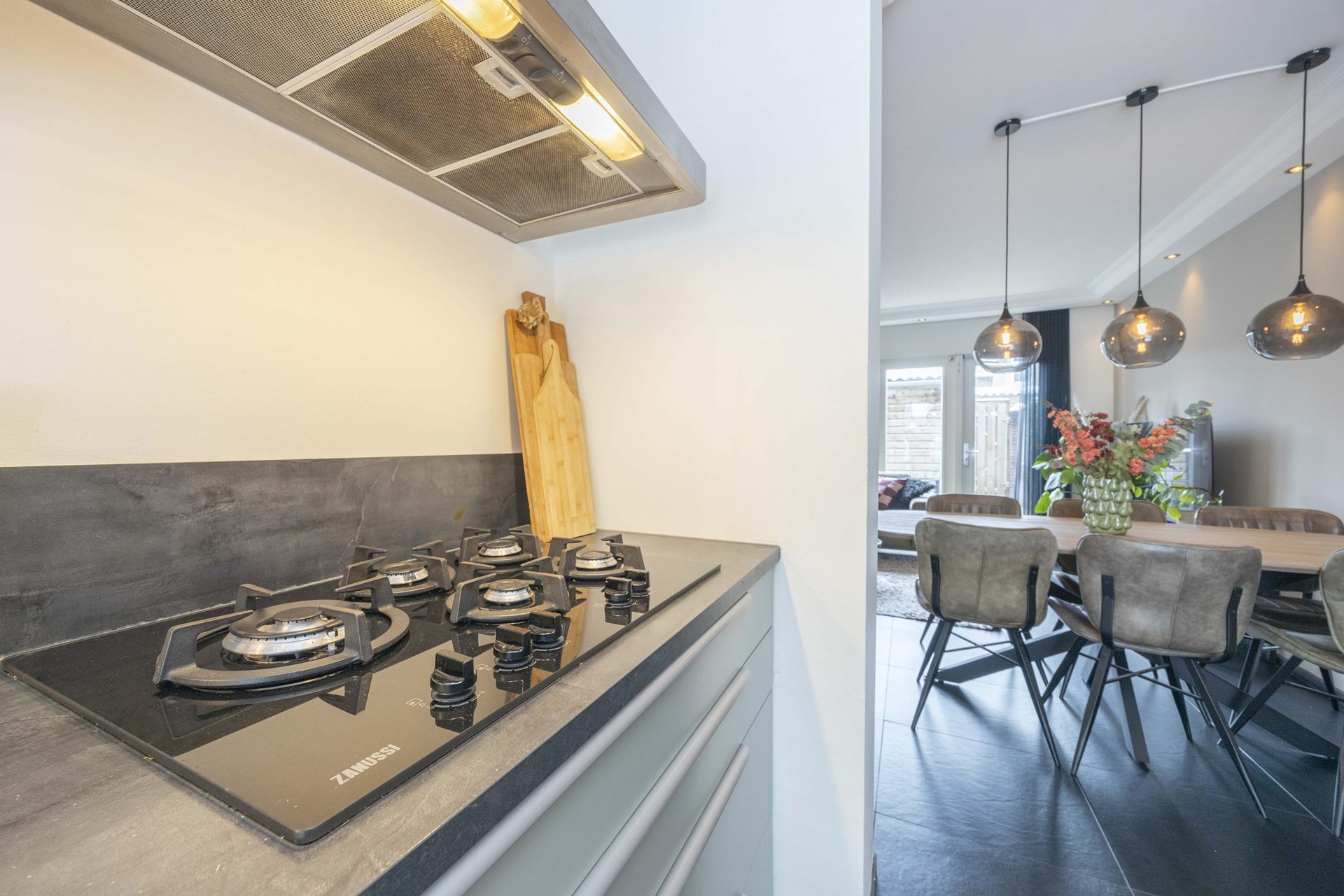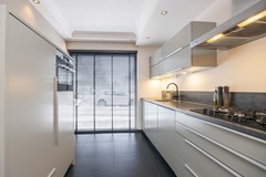 De open keuken vormt het hart van de woning en staat in verbinding met de woonkamer. Hier kook je met gemak op de vijfpits gaskookplaat, met alle benodigde inbouwapparatuur binnen handbereik: een vaatwasser, koelkast, afzuigkap en combi oven. De neutrale, tijdloze afwerking maakt het geheel stijlvol en onderhoudsvriendelijk.