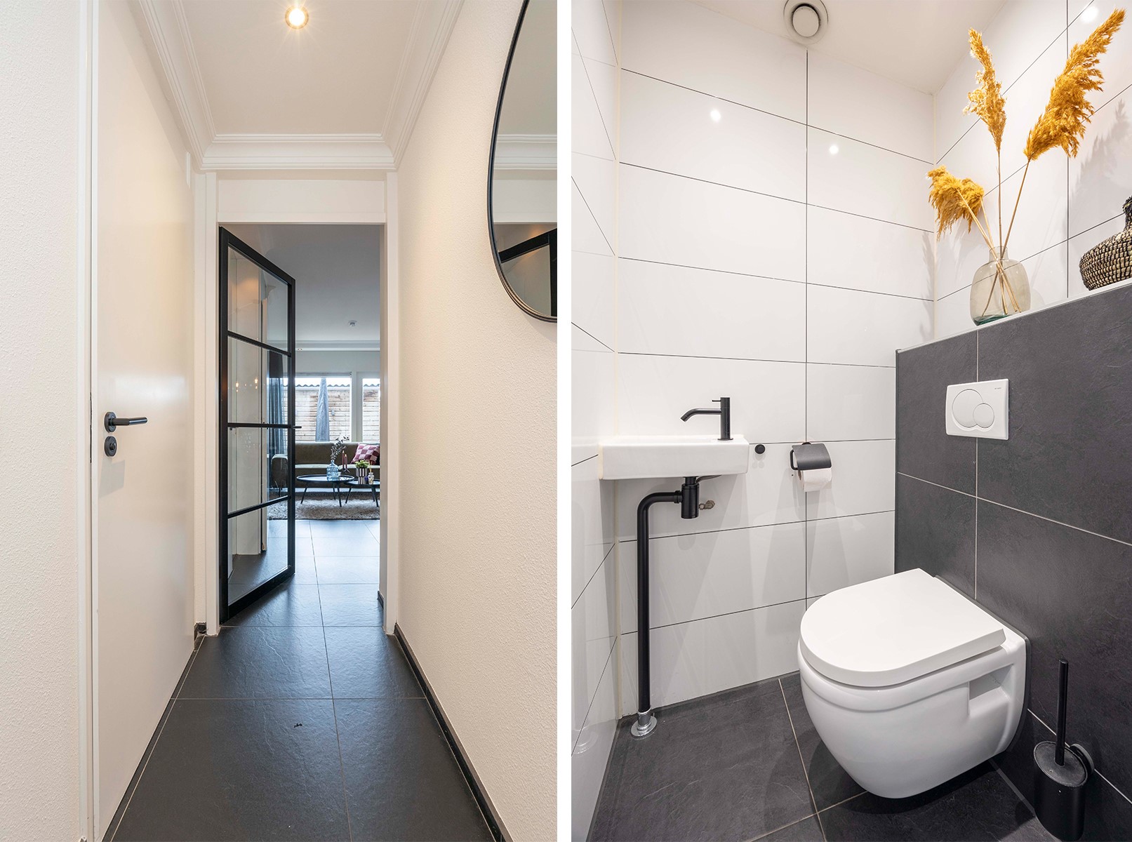 Bij binnenkomst via de nette hal voel je het meteen: dit huis is met zorg bewoond en straalt warmte en comfort uit. De hal is voorzien van een modern toilet met fontein en een meterkast, waarna je doorloopt naar de woonkamer – een fijne, lichte ruimte waar sfeer en functionaliteit samenkomen.