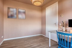 Dat dit appartement twee slaapkamers heeft, maakt het extra flexibel. De tweede kamer—nu in gebruik als royale werkkamer—heeft zelfs een schuifpui naar het balkon. Ideaal voor thuiswerkers, logees, hobby’s of als luxe gastenruimte. De master bedroom is stijlvol en ruim, met plek voor een royaal bed én een grote kastenwand. De ramen zorgen voor heerlijk lichtinval en uitzicht op het rustige binnengebied.
