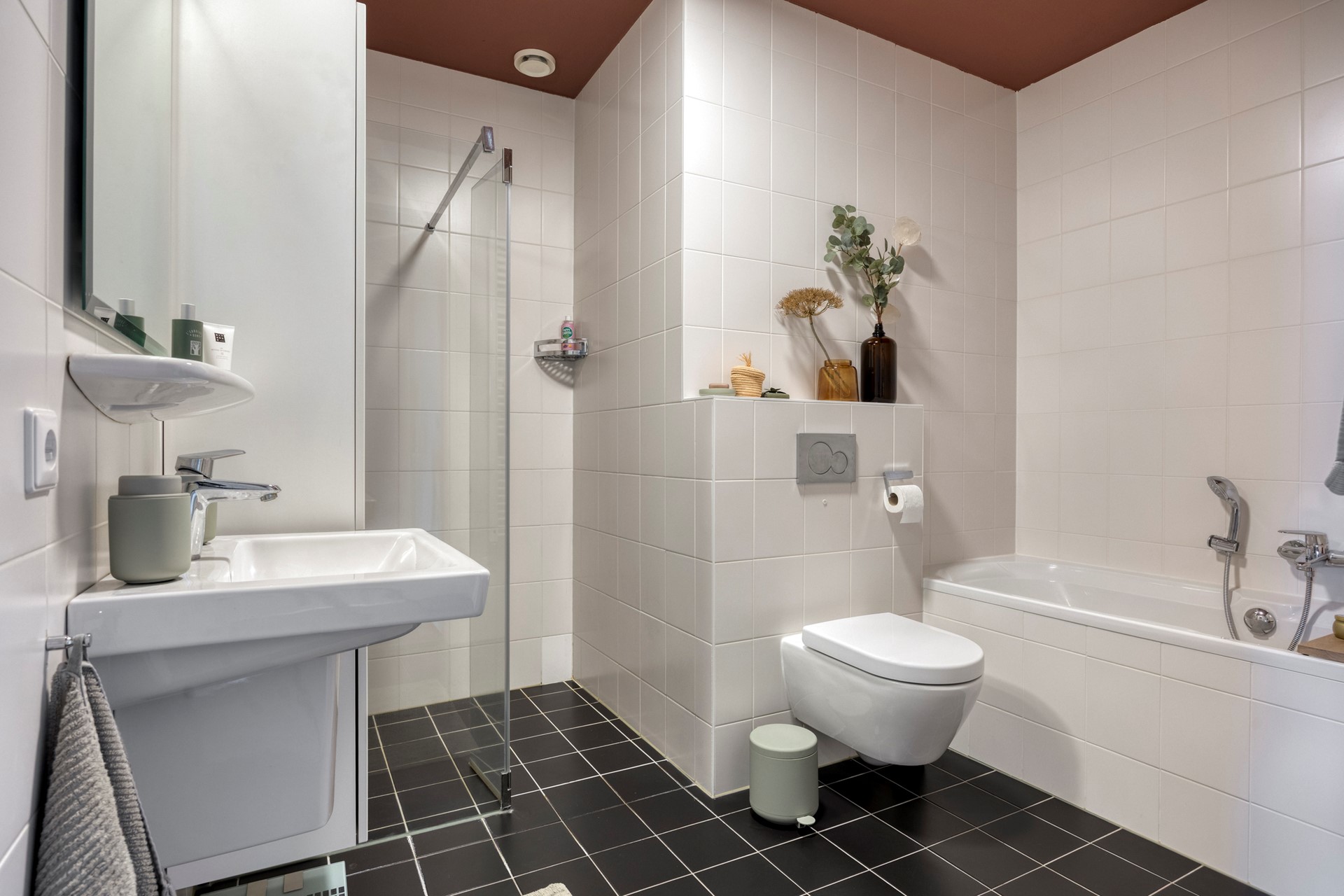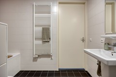 De badkamer voelt als een eigen kleine spa—voorzien van een ligbad, een royale inloopdouche, moderne wastafelmeubel en een tweede toilet. Een luxe en tijdloze ruimte waar je op elk moment van de dag letterlijk kunt opladen.