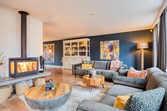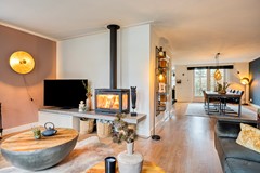 Wauw – dat is het eerste wat je denkt zodra je de woonkamer binnenstapt. De ruimte is indrukwekkend: licht, lucht en luxe komen hier prachtig samen. De grote raampartijen zorgen voor een overvloed aan daglicht en een heerlijk vrij zicht op de voortuin. De moderne houtkachel vormt een knus accent dat uitnodigt tot lange avonden bij het vuur. Of je nu kiest voor één of twee zithoeken, een royale eettafel of extra chillruimte… deze living kan het moeiteloos aan. Via de openslaande tuindeuren heb je direct toegang tot de achtertuin.