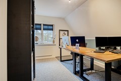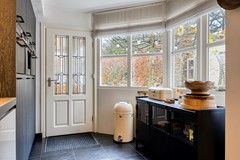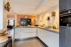 Uitgerust met onder andere een inductiekookplaat met kookveldafzuiging, Quooker, vaatwasser, koelkast, oven, combi-oven/magnetron én een coffee center – allemaal op ooghoogte – is dit een keuken waar iedere kookliefhebber zijn hart aan verliest. Dankzij de grote glaspartijen aan de achterzijde baadt de keuken in het licht en staat hij in directe verbinding met de tuin. Via de keuken bereik je ook de bijkeuken, die weer toegang biedt tot de garage en de achtertuin.