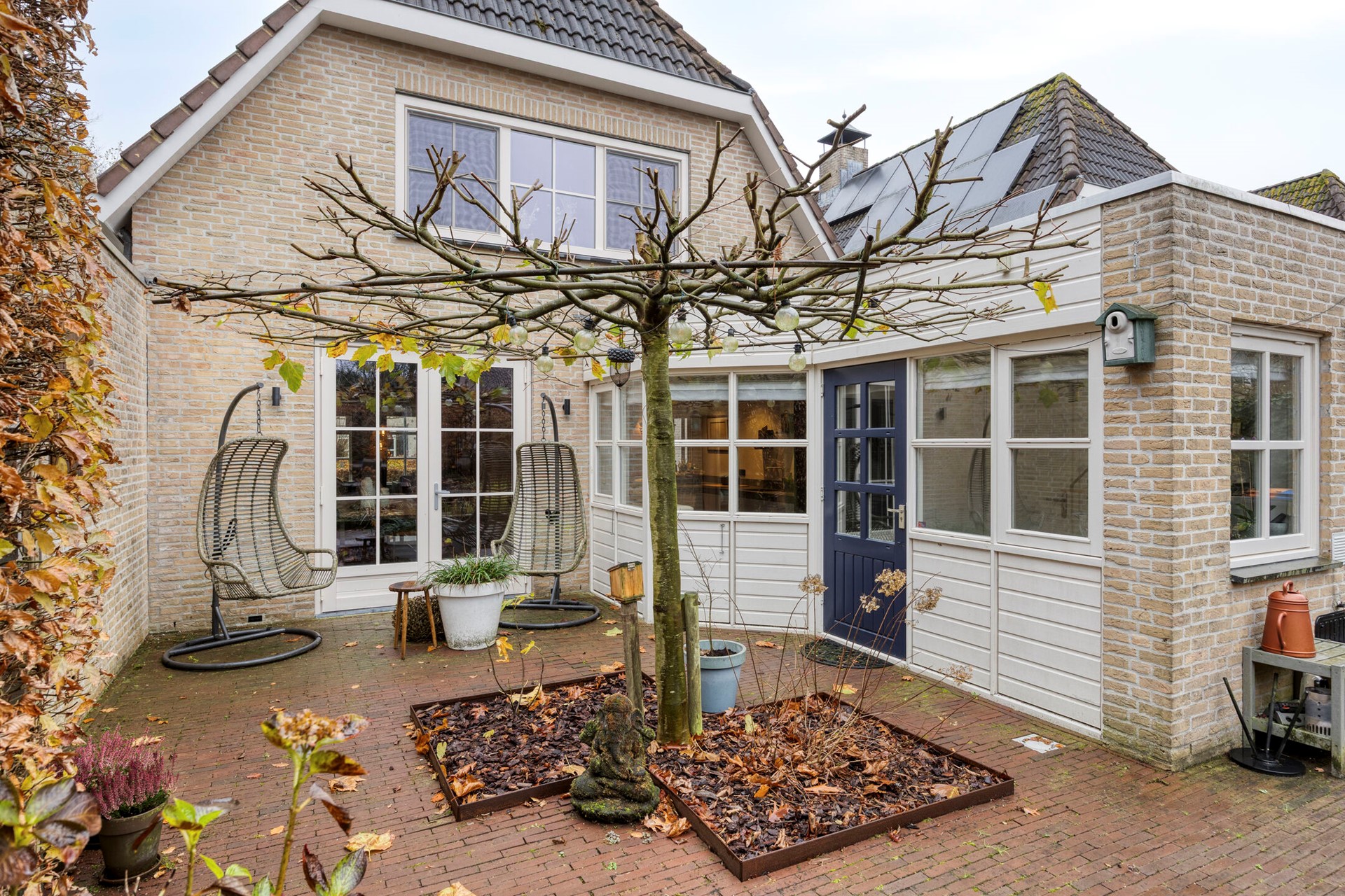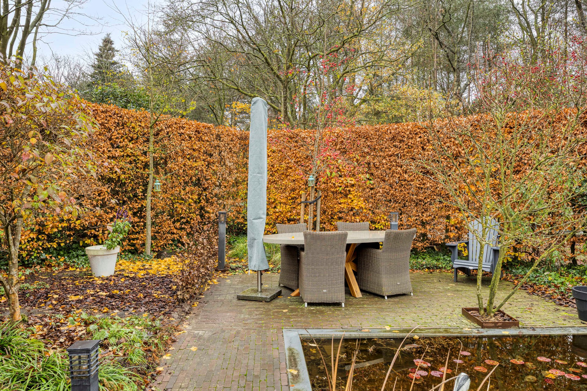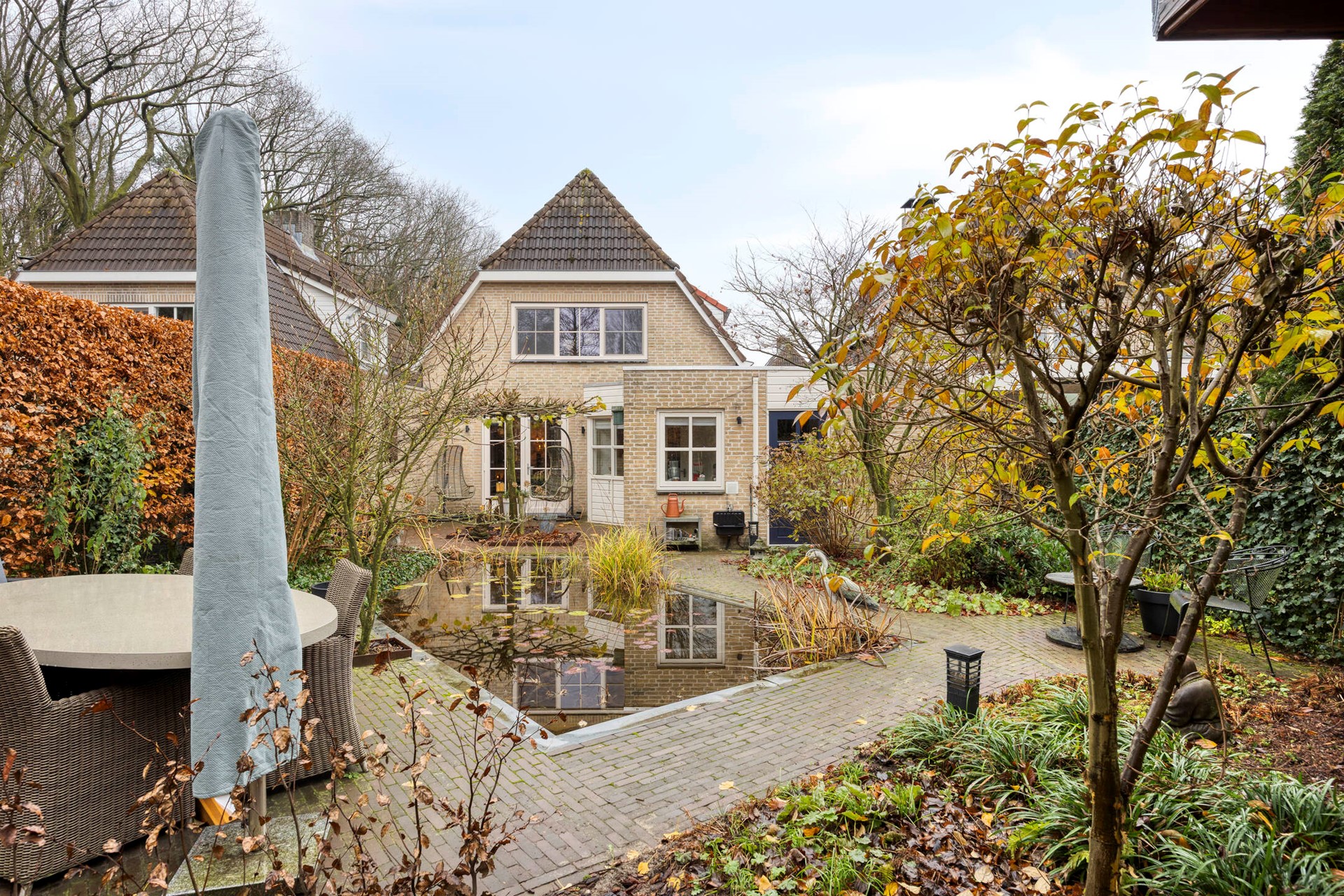 De achtertuin is royaal, groen en verrassend sfeervol aangelegd. Gelegen op het noordoosten, waardoor je ’s ochtends direct van de zon geniet. De verschillende terrassen – speels gescheiden door een vijver – bieden volop mogelijkheden om te loungen, dineren of in rust te lezen. Een van de terrassen is zelfs overkapt, waardoor je het hele jaar door buiten kunt leven. Het vele groen, de waterpartij en het ontbreken van directe achterburen zorgen voor optimale privacy en een heerlijk natuurlijke ambiance. De garage biedt plek voor je auto en fiets, én huisvest een extra berging met aansluitingen voor de wasmachine en droger. De voortuin, gelegen op het zuidwesten, is onderhoudsvriendelijk en strak aangelegd.