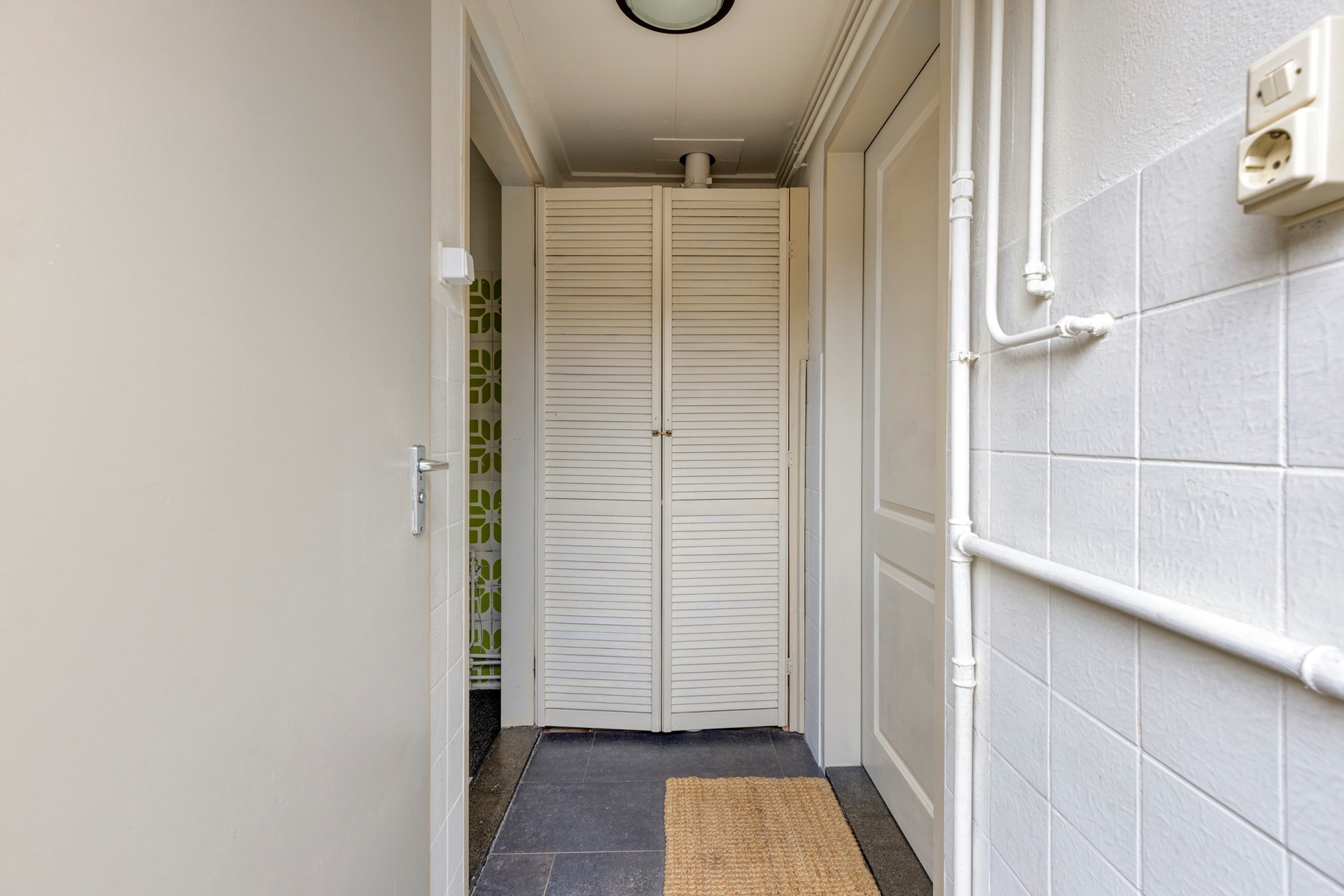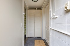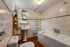 Achter de keuken bevinden zich de badkamer en bijkeuken, praktisch gesitueerd maar met oog voor comfort. De volledig betegelde badkamer is uitgerust met een ligbad met douche, wastafel en toilet — een fijne plek om te ontspannen na een lange dag. De bijkeuken biedt ruimte voor de wasmachine en beschikt over een achterdeur, wat zorgt voor extra gemak en functionaliteit in het dagelijks leven.