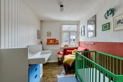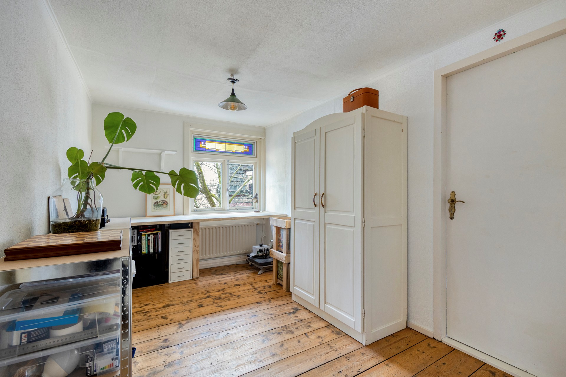 Via de vaste trap bereik je de eerste verdieping, waar drie slaapkamers op je wachten. Twee kamers aan de voorzijde en een royale hoofdslaapkamer aan de achterzijde, waar rust en privacy centraal staan. Alle slaapkamers beschikken nog over een authentieke houten vloer — een prachtig detail dat bijdraagt aan het karakter en de ziel van het huis. Elke kamer voelt licht, prettig en flexibel in gebruik, of je nu een slaapkamer, werkplek of hobbyruimte nodig hebt.