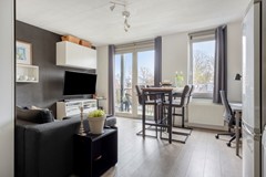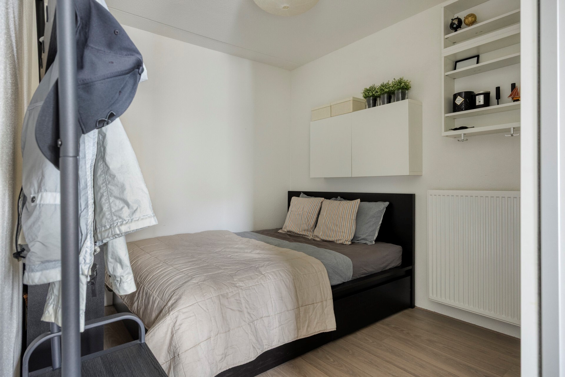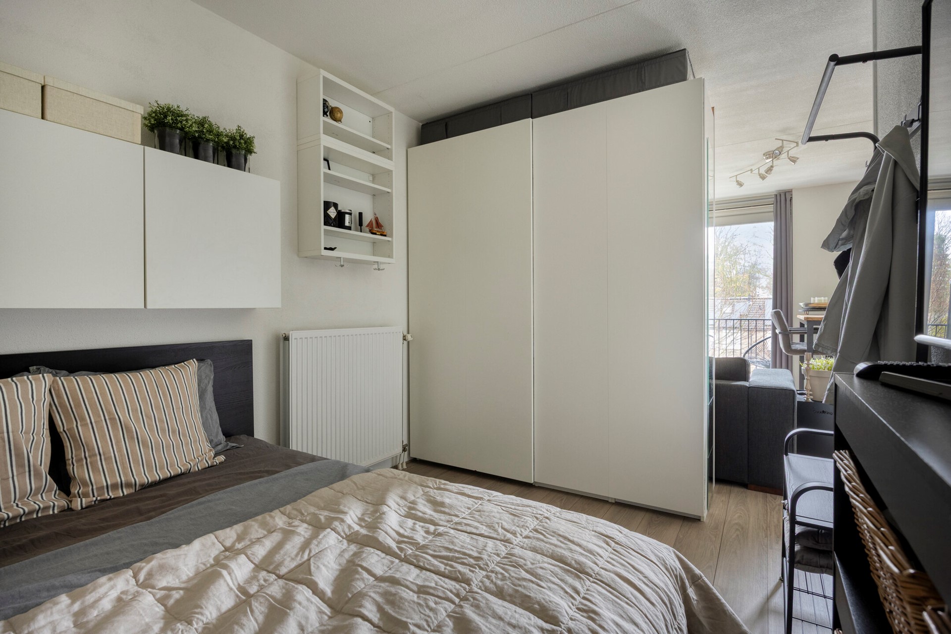De dubbele openslaande deuren naar het oostelijk gelegen balkon zijn een enorme sfeermaker. Zodra je ze ’s morgens openzwaait, stroomt het licht naar binnen en vormt het balkon jouw persoonlijke ochtendplek. Hier drink je je eerste koffie in de frisse buitenlucht, met de zon die net over de daken komt.