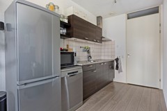 De open keuken staat in directe verbinding met de woonkamer en vormt daardoor echt het hart van de studio. Uitgevoerd in warme bruine tinten met lichte tegels, en uitgerust met een inductiekookplaat (4 zones), afzuiging en vaatwasser, biedt deze keuken precies de combinatie van stijl en functionaliteit die je nodig hebt.