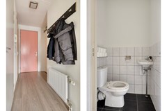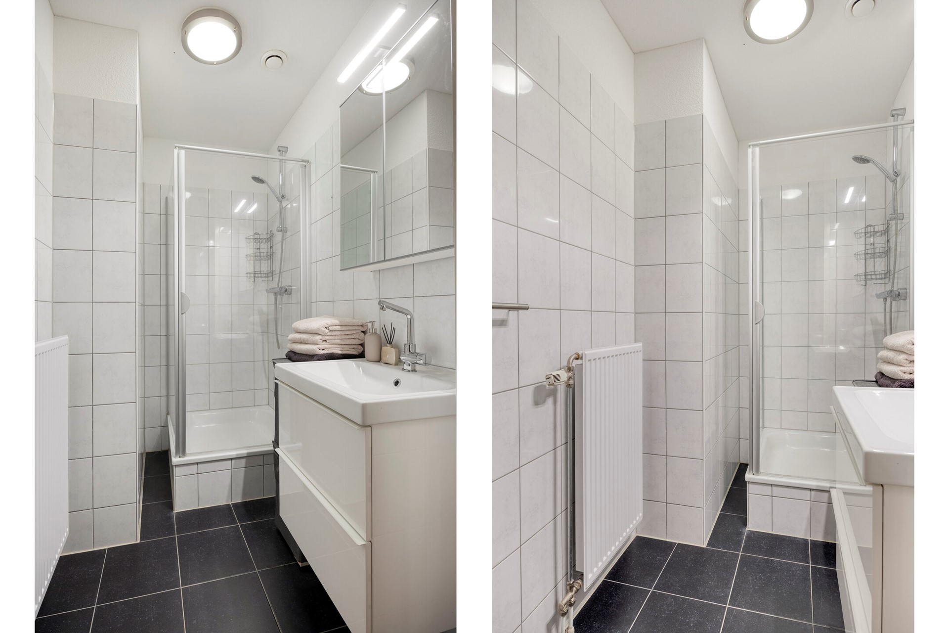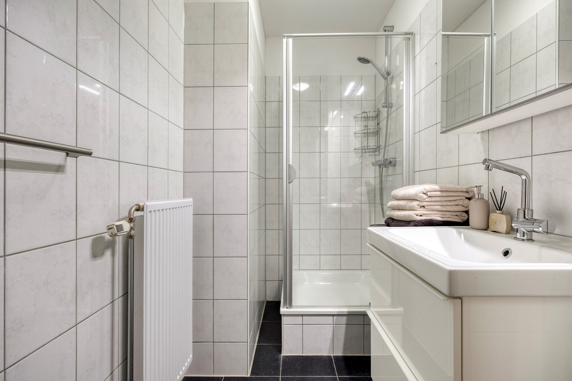 De badkamer is verzorgd, volledig betegeld en voorzien van een wastafel, badmeubel, spiegel, radiator en nette douchecabine. In de hal vind je bovendien een apart toilet met fonteintje — een luxe die je niet vaak aantreft in een studio.