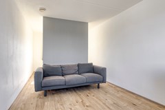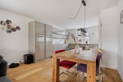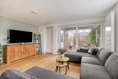 De woonkamer is een heerlijke plek om te ontspannen en te genieten. Dankzij de grote raampartijen en de schuifpui naar de tuin baadt de ruimte in natuurlijk licht. De strakke wandafwerking in combinatie met de warme eikenhouten vloer zorgt voor een moderne, maar tegelijkertijd uitnodigende sfeer waar je je direct thuis voelt.