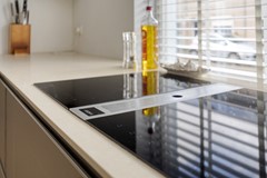 De open keuken is een absolute eyecatcher en uitgevoerd in luxe hoogglans met een fraai composieten werkblad. Hier kook je met plezier dankzij de hoogwaardige Bauknecht apparatuur, waaronder een combi-oven, combi-stoomoven, Bora inductiekookplaat met geïntegreerde afzuiging en zelfs twee koelkasten en een vriezer. Deze keuken is niet alleen functioneel, maar ook een stijlvolle ontmoetingsplek waar koken en samenzijn moeiteloos samenkomen.