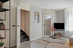 De uitgebouwde woonkamer aan de achterzijde is zonder twijfel het hart van het huis. Hier is ruimte gecreëerd om te leven, te ontspannen en te genieten. De strakke stucwerkafwerking en het overvloedige licht zorgen voor een rustige, moderne basis. De trapkast en trapopgang zijn subtiel geïntegreerd, waardoor functionaliteit en esthetiek hand in hand gaan.