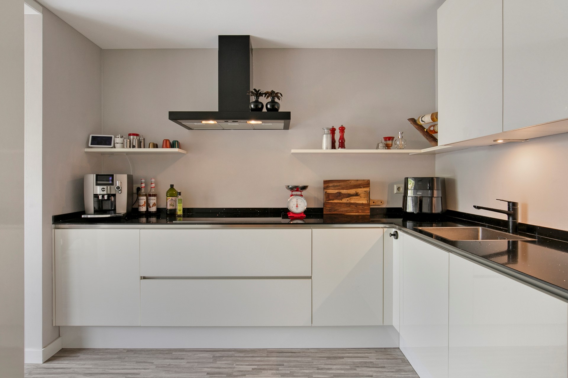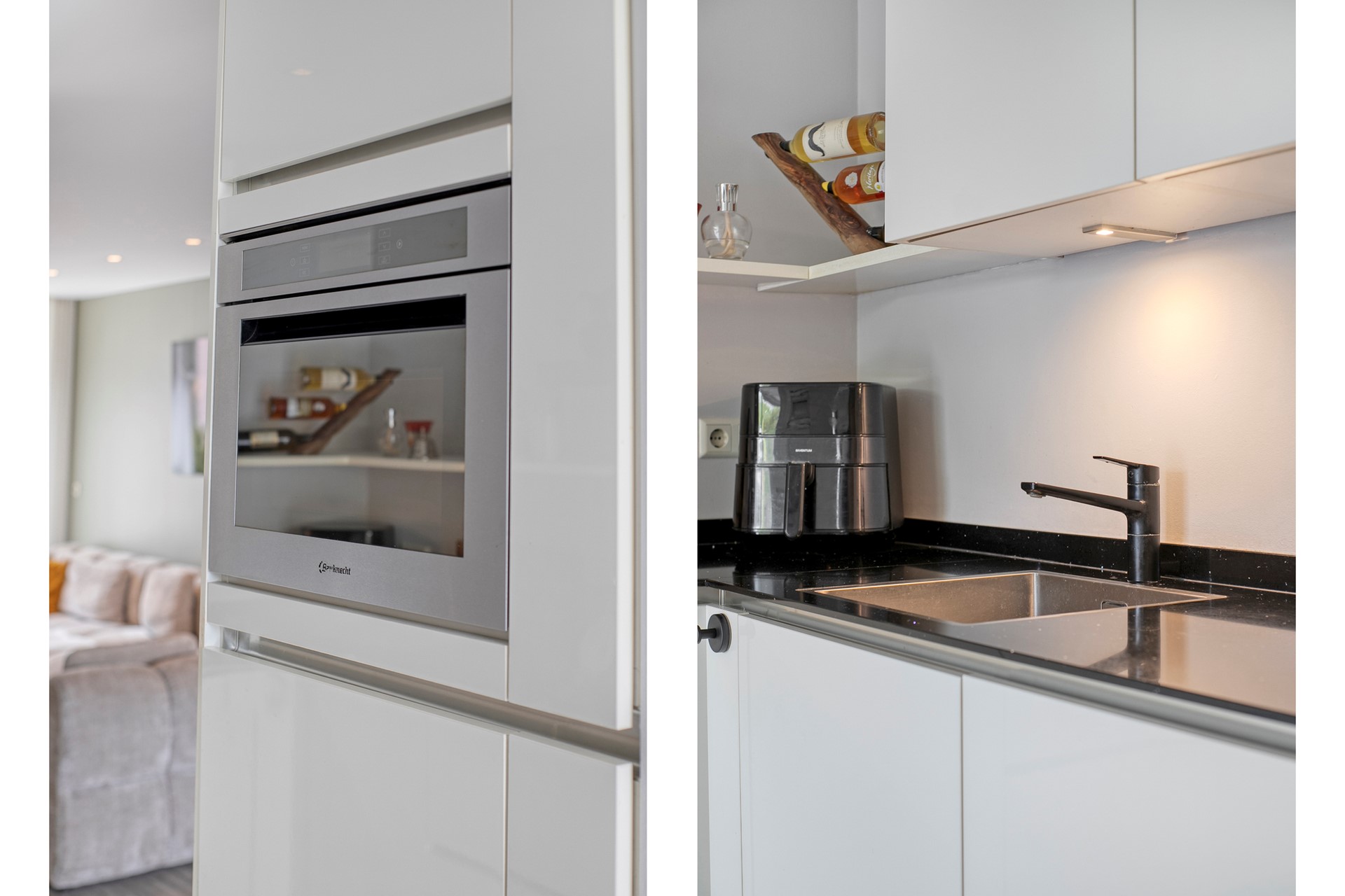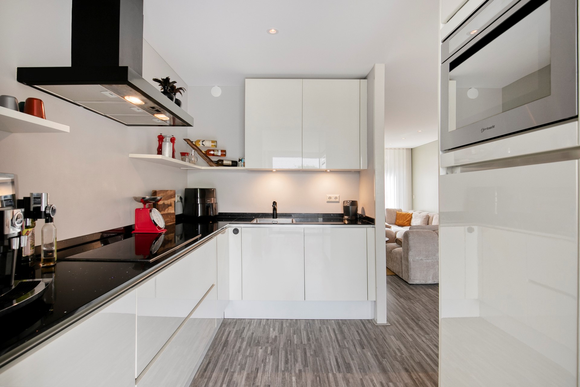 De open keuken vormt een natuurlijke verbinding tussen het zitgedeelte en de eethoek. Deze in 2016 geplaatste keuken is uitgerust met hoogwaardige apparatuur, waaronder een inductiekookplaat, koelkast, vaatwasser, combi-oven en afzuigkap. Hier kook je niet alleen – hier beleef je momenten met familie en vrienden, omringd door comfort en ruimte.