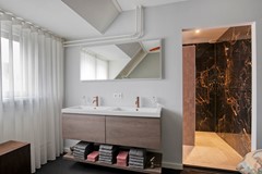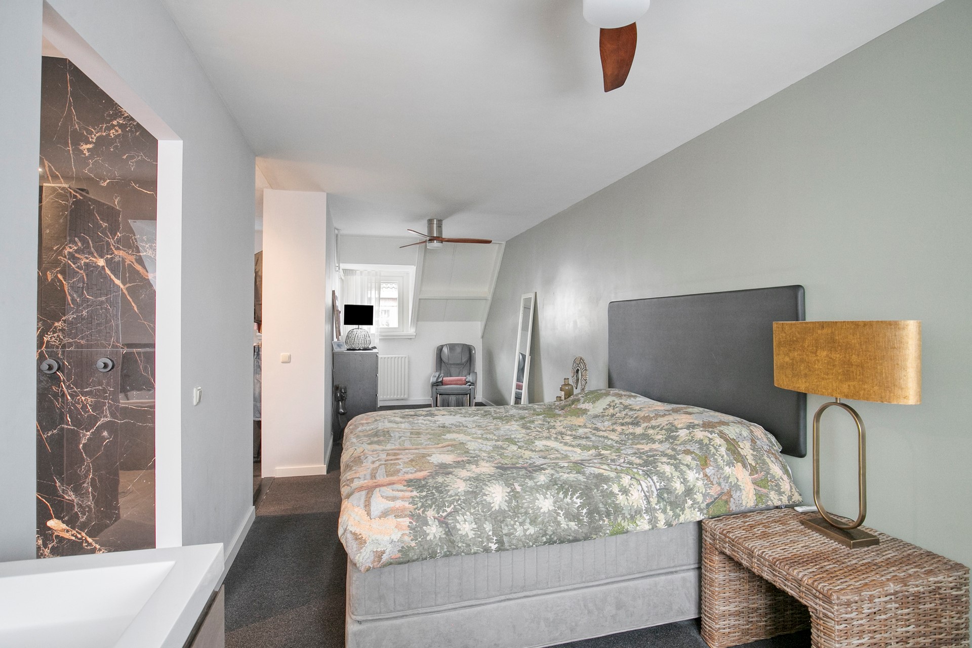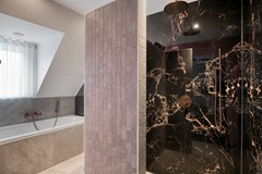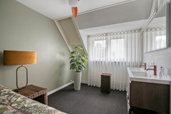 Op de eerste verdieping vind je twee royale slaapkamers (voorheen drie), waarbij de slimme indeling zorgt voor extra ruimte en rust. De hoofdslaapkamer is een ware suite, met directe toegang tot de recent vernieuwde badkamer. Deze luxe ruimte, nog maar een half jaar oud, ademt ontspanning met een ligbad, inloopdouche en toilet. De dubbele wastafel in de slaapkamer zelf geeft het geheel een exclusieve, bijna hotelachtige uitstraling.