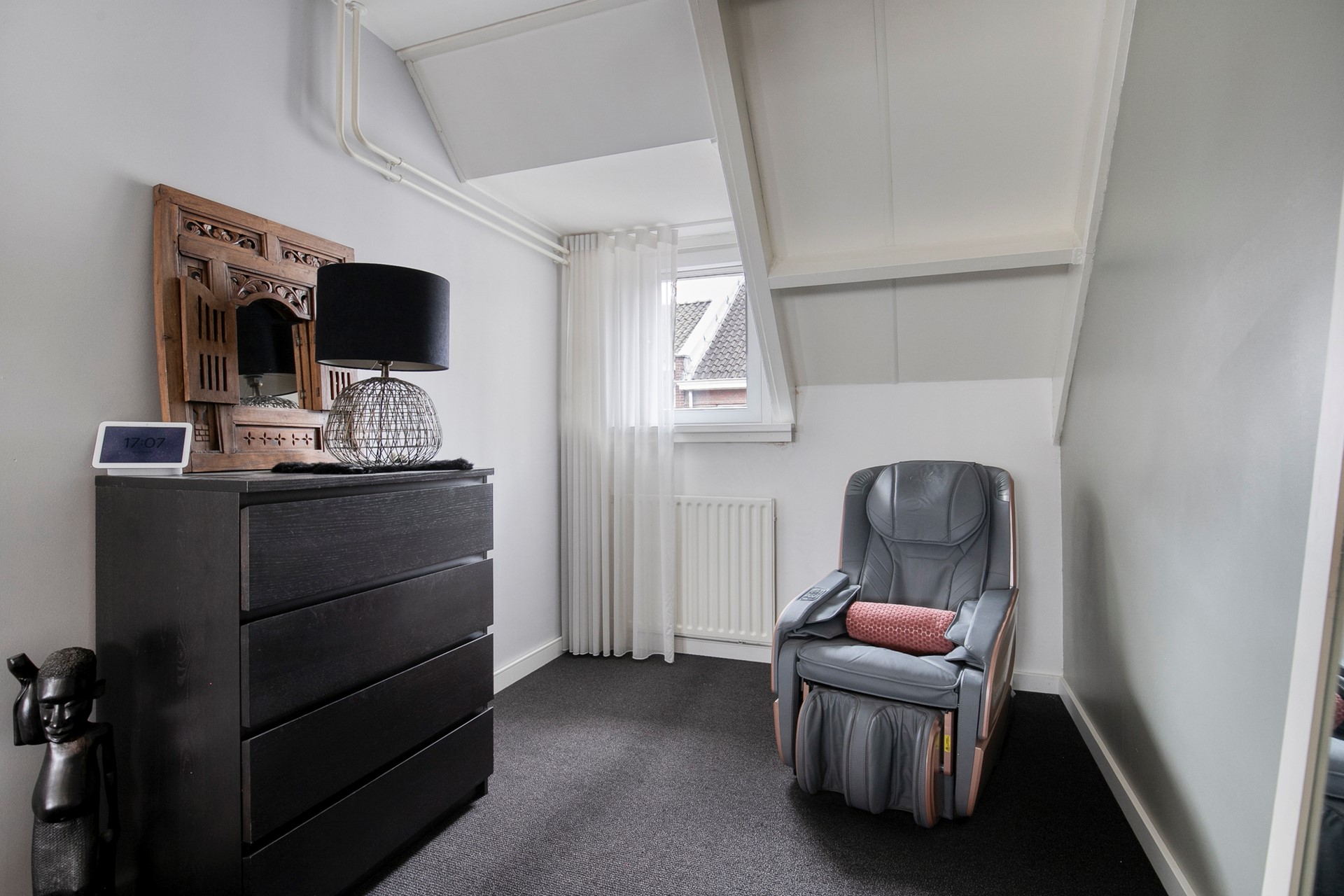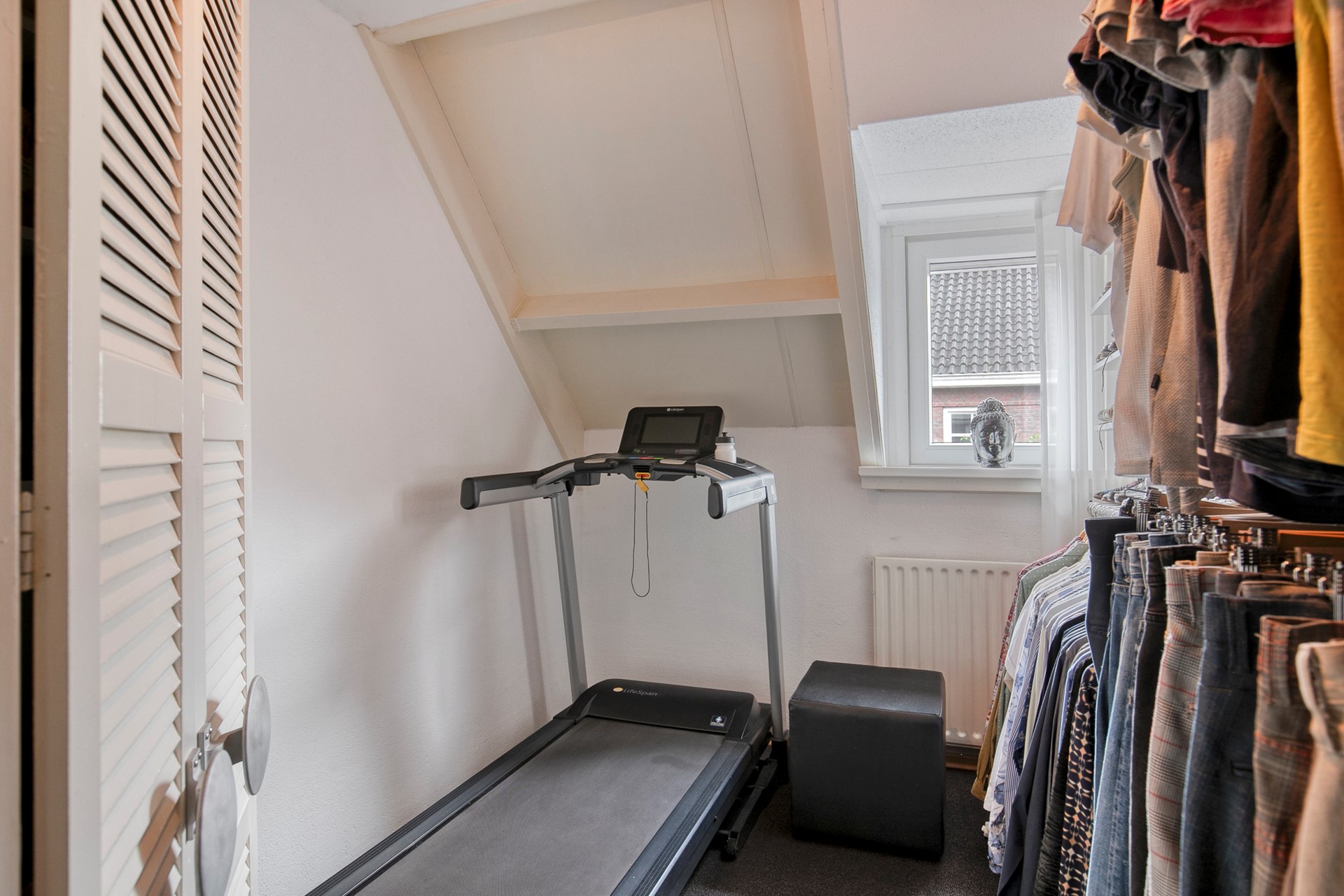 De tweede verdieping, bereikbaar via een vaste trap, biedt een volwaardige derde slaapkamer. Dankzij het grote dakraam voelt deze verdieping licht en ruim aan. Hier vind je ook praktische voorzieningen zoals de wasmachineaansluiting en de omvormer van de zonnepanelen, evenals volop bergruimte.
