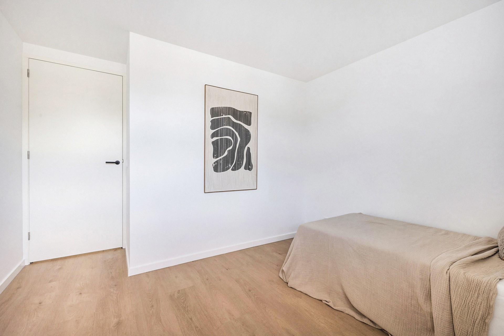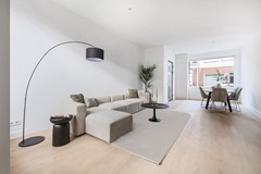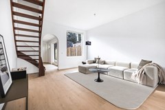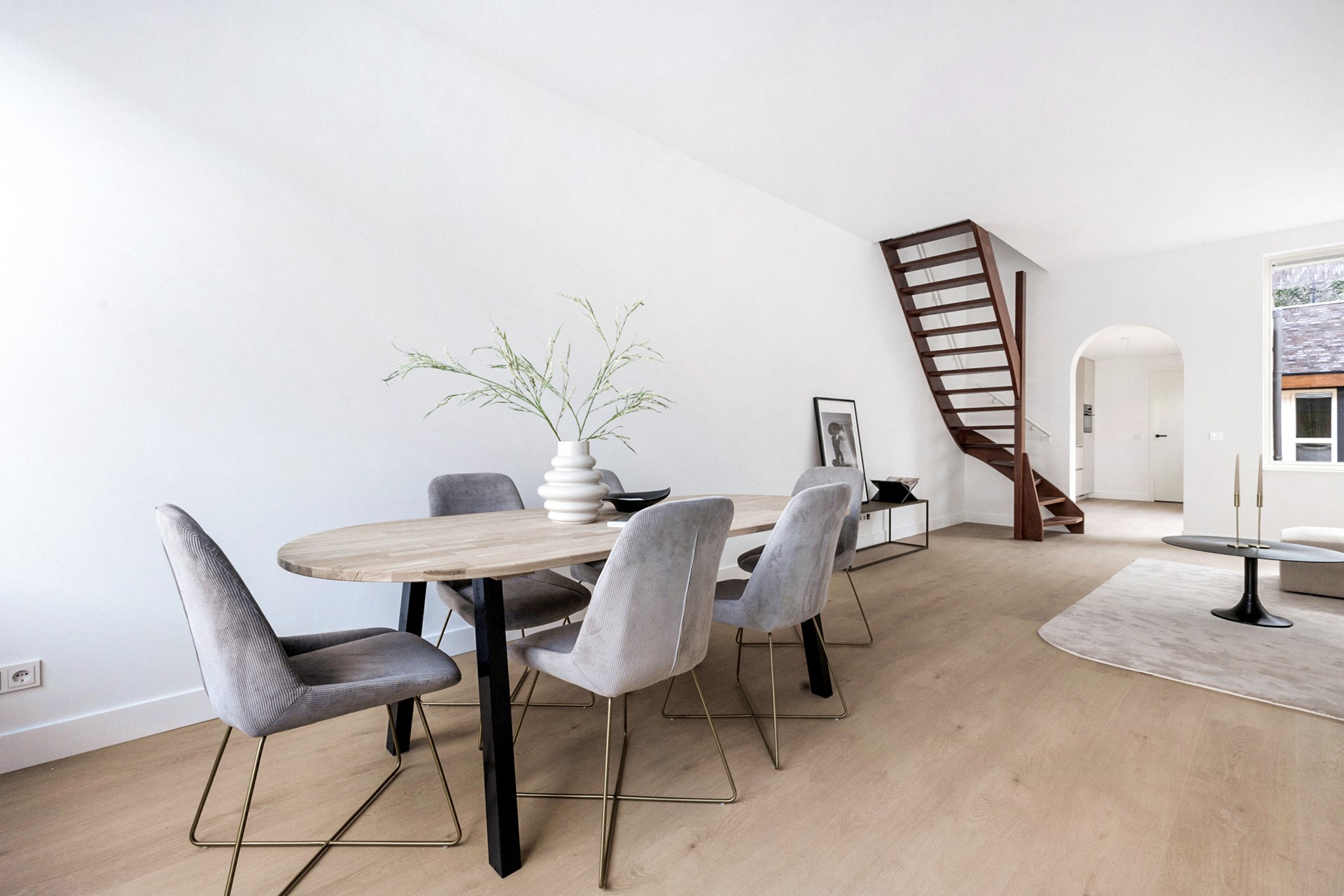 De woonkamer ademt rust, openheid en verfijning. Grote raampartijen laten het daglicht rijkelijk binnen, waardoor de eikenhouten vloer prachtig tot zijn recht komt. De strak gestucte wanden en het hoogstaande afwerkingsniveau zorgen voor een serene basis waarin elke woonstijl tot bloei komt.