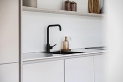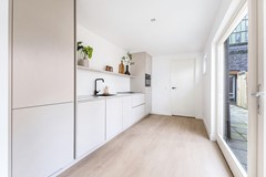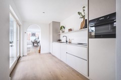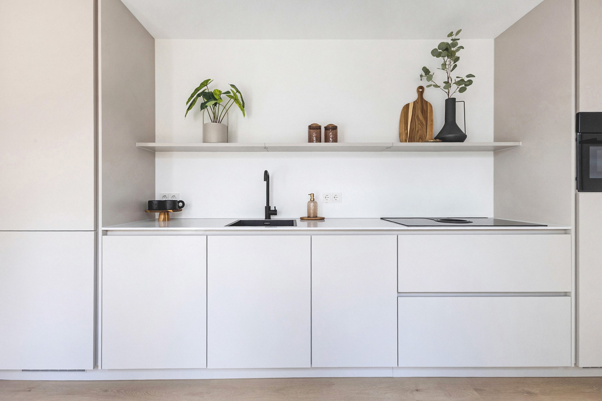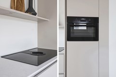 De nieuwe keuken is een lust voor het oog: greeploos, uitgevoerd in een zachte taupe tint, met een strak composieten werkblad. De zwarte spoelbak en kraan voegen een moderne elegantie toe, terwijl de inductiekookplaat met geïntegreerd afzuigsysteem zorgt voor een rustige, minimalistische uitstraling. Geheel uitgerust met een combi-oven, koel-vriescombinatie en vaatwasser vormt dit een keuken waar koken vanzelf een moment van genieten wordt.