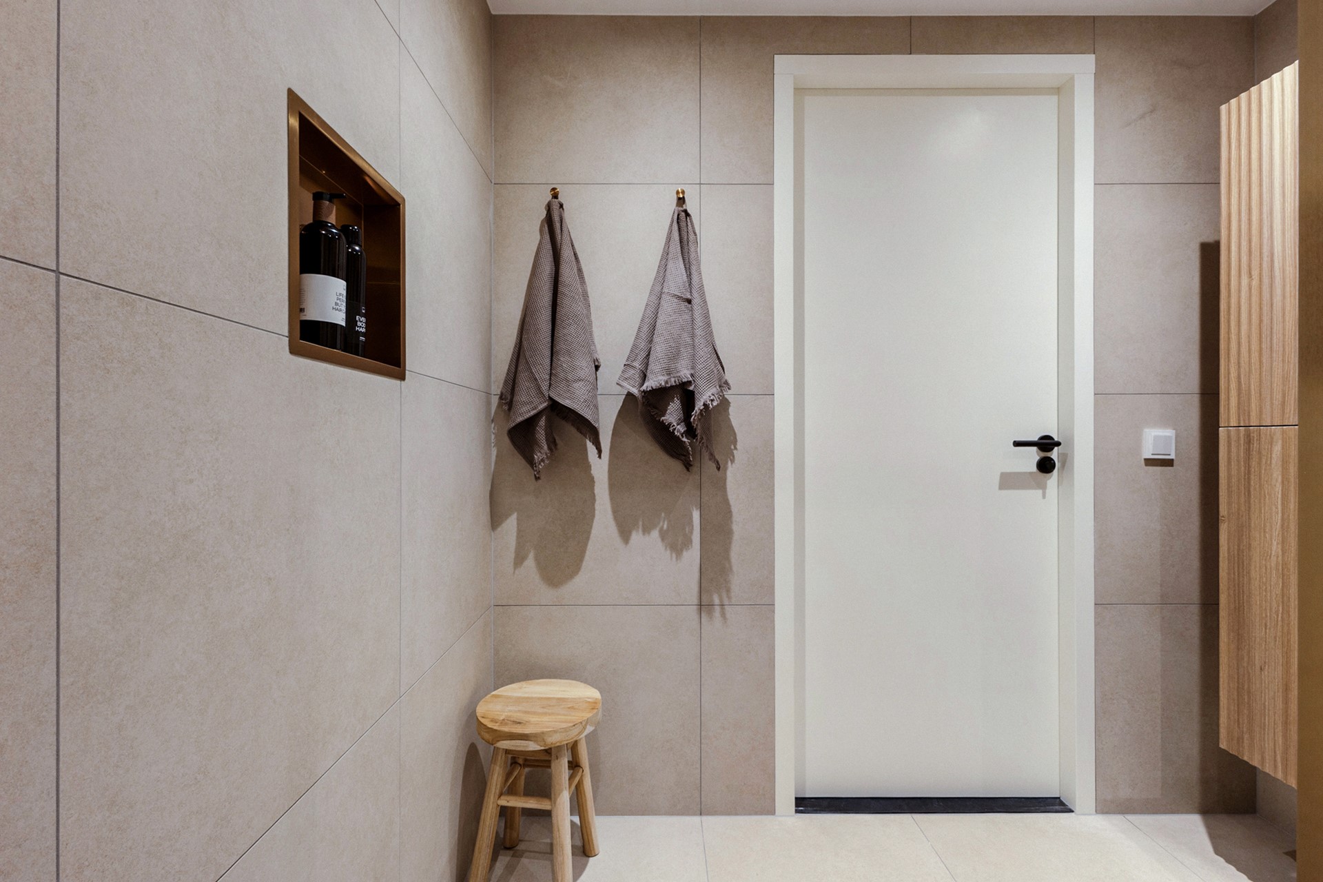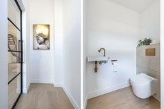 In de bijkeuken vind je het toilet en de aansluiting voor de wasmachine. Praktische voorzieningen die slim uit het zicht zijn geplaatst, zonder in te leveren op sfeer of stijl.