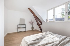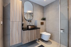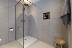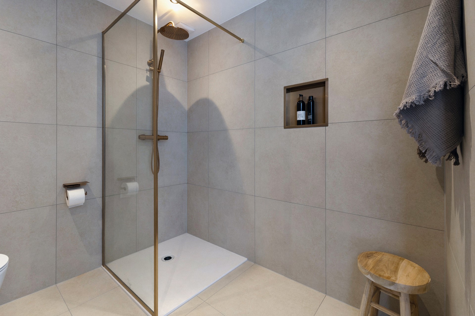 De eerste verdieping biedt drie slaapkamers, allemaal voorzien van dezelfde prachtige eikenhouten vloer als beneden. Dit doorlopende materiaalgebruik creëert een gevoel van harmonie en luxe. De badkamer is een waar hoogtepunt: strak ontworpen, met grote grijzige tegels, gouden accenten en een houten wastafelmeubel dat warmte toevoegt. De inloopdouche en het tweede toilet maken de ruimte compleet tot een luxe wellnesservaring.