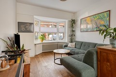 De woonkamer is aan de voorzijde uitgebouwd met een erker, wat zorgt voor een speels effect en extra lichtinval. Het is een ruimte waar je moeiteloos een royale zithoek én een grote eettafel kwijt kunt. Het hoge plafond, de strak afgewerkte wanden en de warme eikenhouten vloer vormen samen een stijlvol en harmonieus geheel. Hier voel je je direct op je gemak — of je nu gasten ontvangt of geniet van een rustige avond thuis.