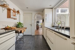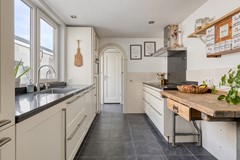 Aan de achterzijde is een uitbouw gerealiseerd waarin zich de keuken bevindt. Het grote raam boven het aanrecht laat het daglicht rijkelijk binnenstromen en maakt koken hier extra prettig. De lichte keuken is van alle gemakken voorzien: een inductie kookplaat met RVS afzuigkap, vaatwasser, koelkast, combi-oven/magnetron op ooghoogte én een ingebouwd koffiezetapparaat voor dat perfecte begin van de dag. Praktisch detail: onder de trap bevindt zich een handige bergkast.