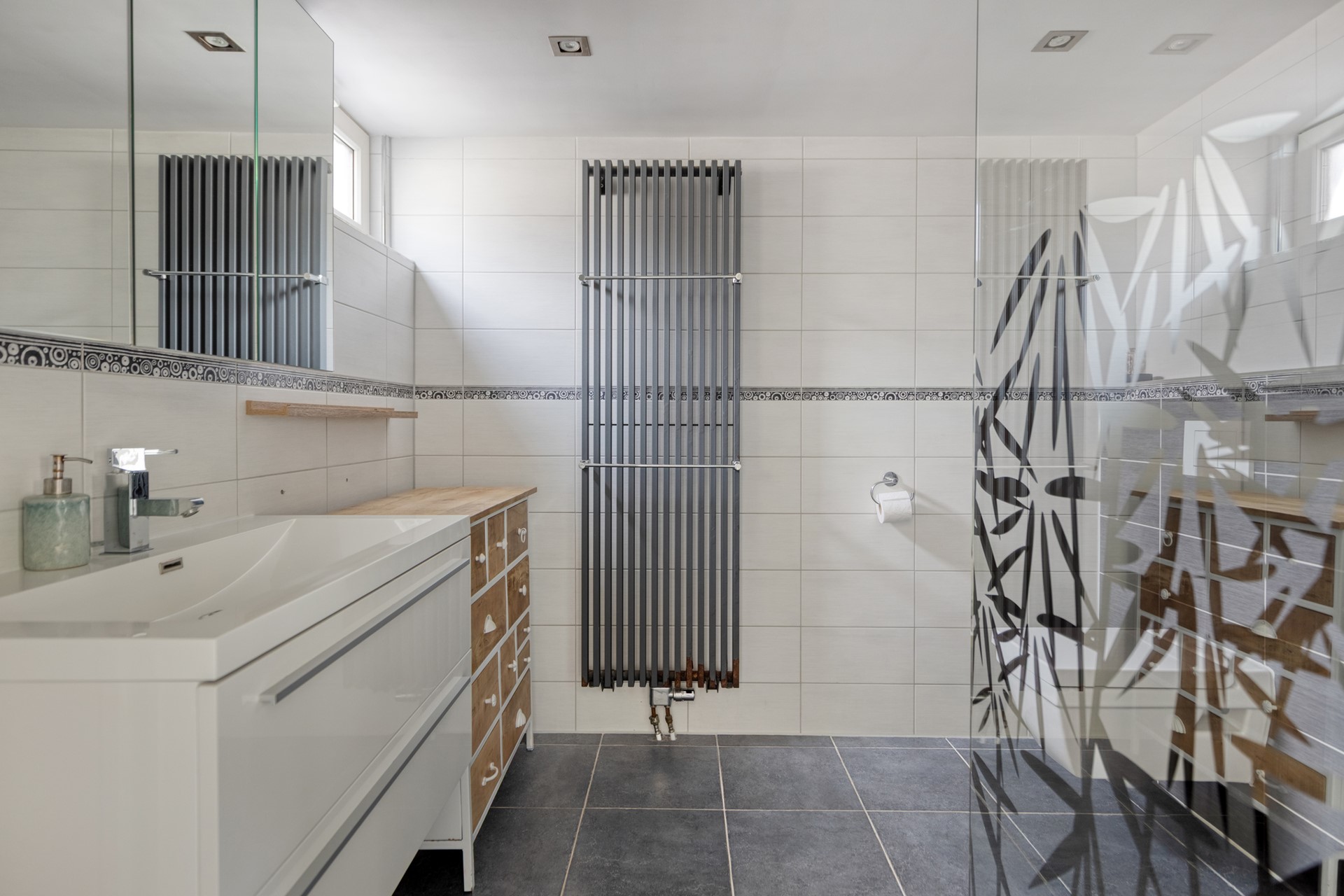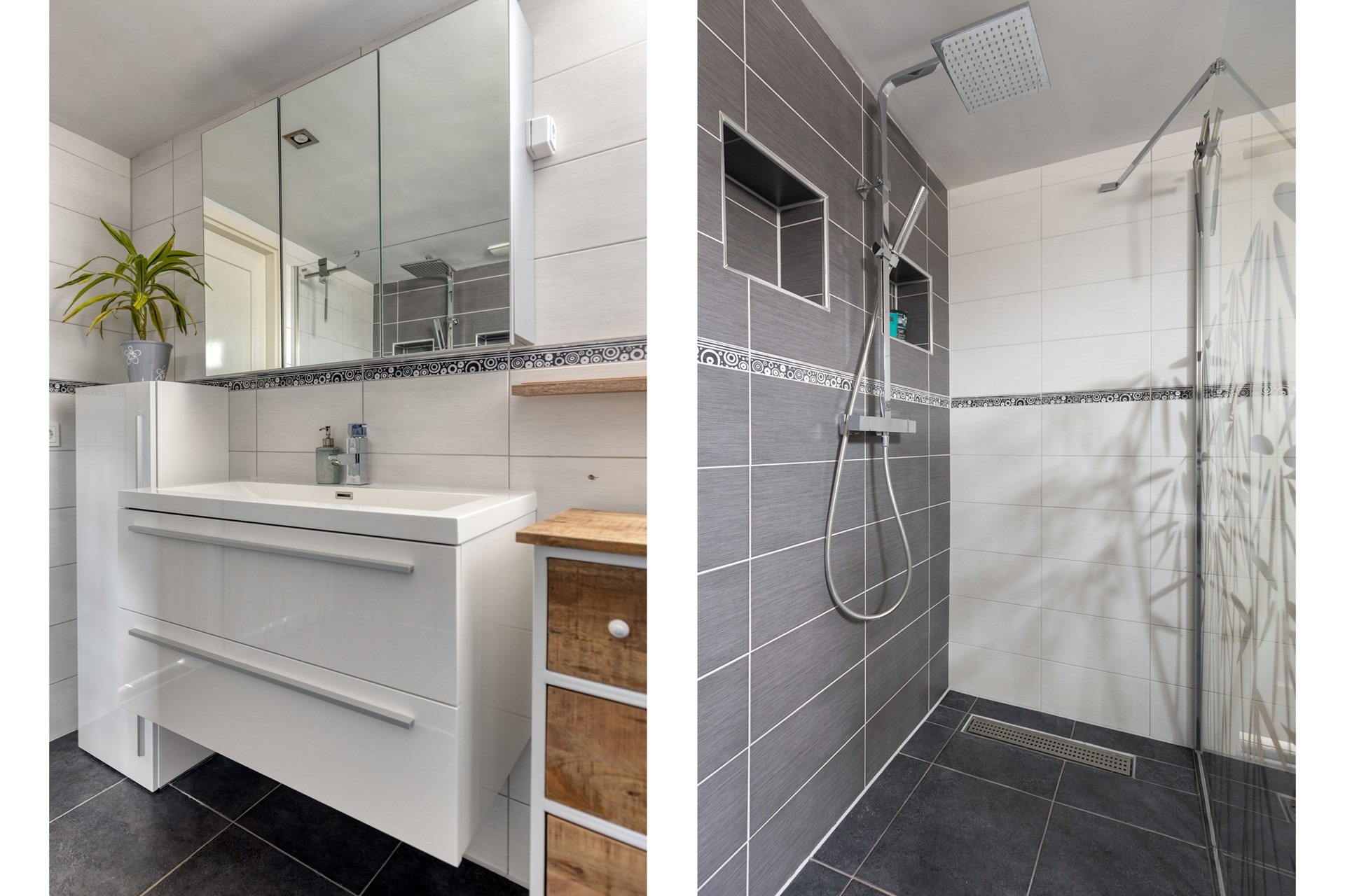 Via het portaal achter de keuken bereik je zowel de badkamer als de achtertuin. De volledig betegelde badkamer is strak en modern ingericht met een brede wastafel met ondermeubel, een toilet en een royale inloopdouche. Extra comfortabel is de aanwezige vloerverwarming, waardoor deze ruimte ook op koudere dagen een aangename plek is om de dag te beginnen of ontspannen af te sluiten.