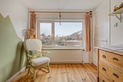 Op de eerste verdieping geeft de overloop toegang tot twee slaapkamers. Aan de voorzijde bevindt zich de grootste slaapkamer, opnieuw met die karakteristieke erker en uitzicht over de Leenherenstraat. Aan de achterzijde ligt een tweede, ruime slaapkamer — perfect als kinder-, hobby- of thuiswerkkamer. Beide kamers zijn keurig afgewerkt en voorzien van een massief grenen houten vloer met een warme, natuurlijke uitstraling, wat bijdraagt aan de rustige en comfortabele sfeer.