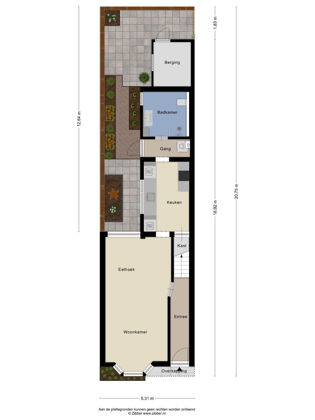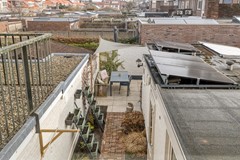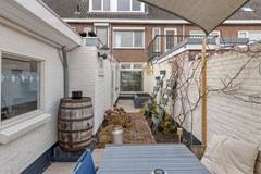 De onderhoudsvriendelijke achtertuin is strak aangelegd met keramische tegels, wat betekent: geen groene aanslag en minimaal onderhoud. Door de lengte van de tuin profiteer je hier niet alleen van ochtendzon, maar kun je de hele dag van de zon genieten — een zeldzaam pluspunt in deze buurt. Achterin de tuin bevindt zich een ruime berging voor fietsen en tuinspullen. Dankzij de achterom is de tuin ook praktisch en goed bereikbaar.