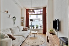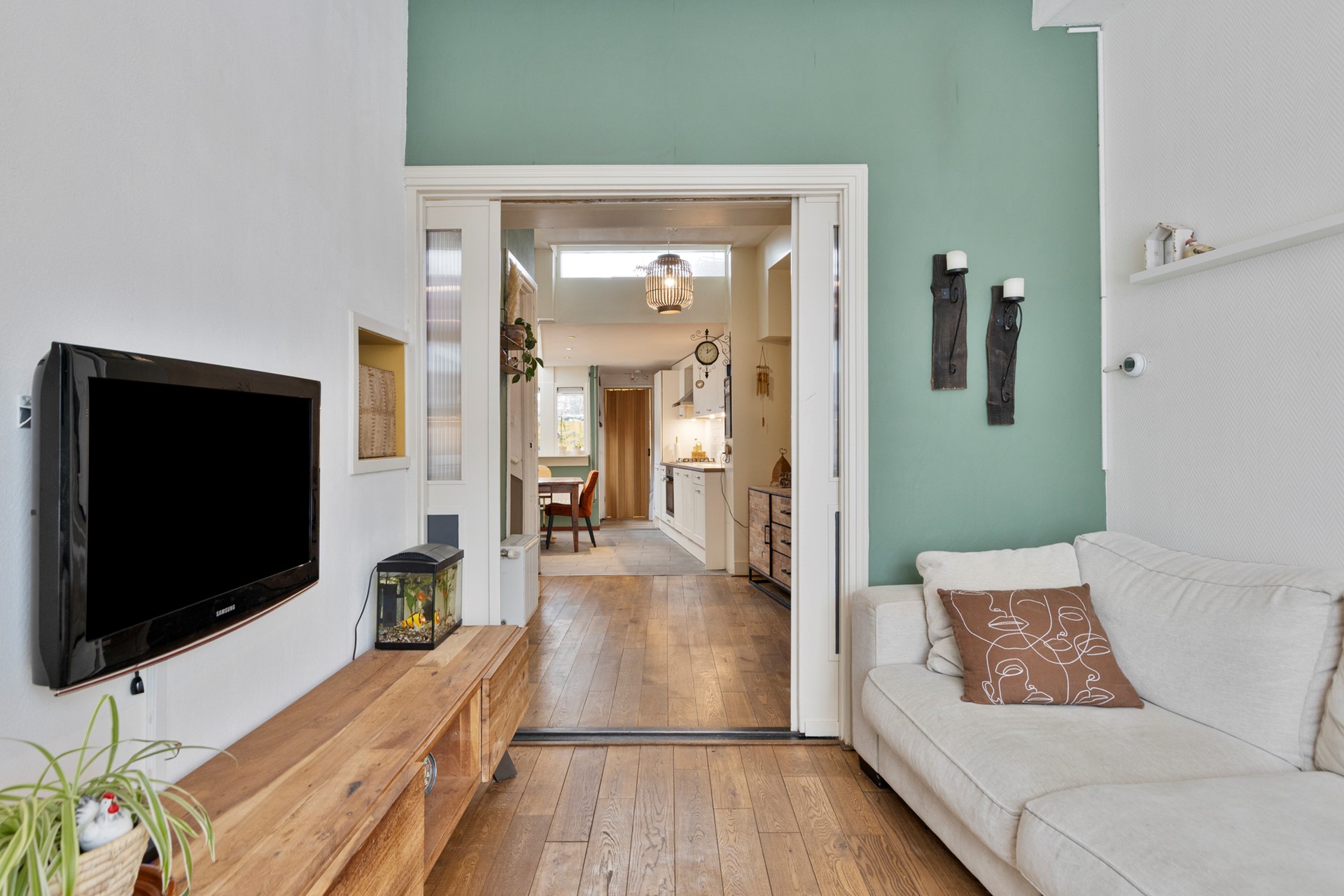 De woonkamer is een heerlijke leefruimte waar sfeer en comfort samenkomen. De warme houten vloer, de glas-in-loodramen boven het grote raam aan de straatzijde en de klassieke ensuite deuren zorgen voor een tijdloze elegantie. Dit is een plek om te ontspannen, te leven en te genieten – met een fijne lichtinval gedurende de dag.