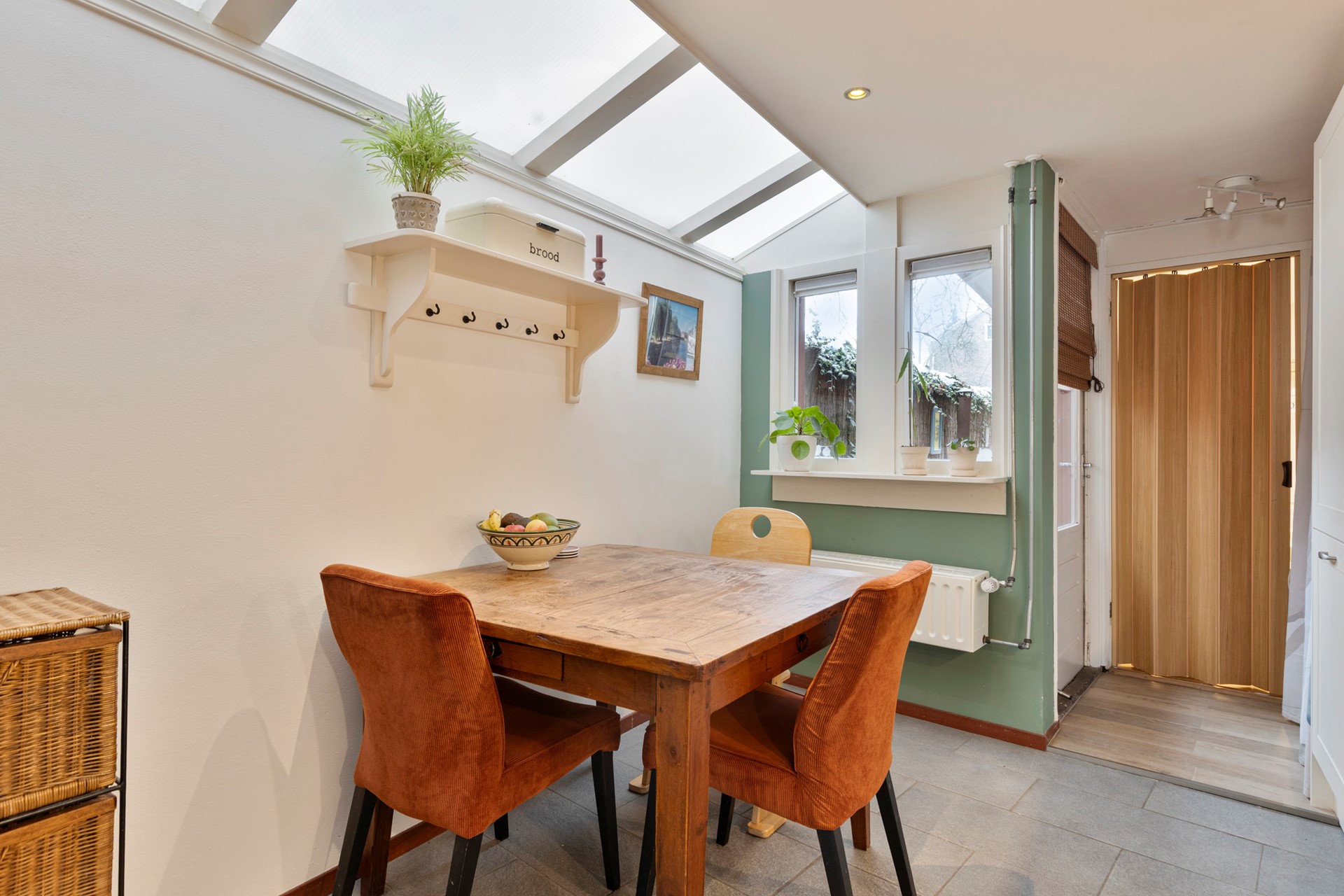 De woonkeuken is praktisch én uitnodigend. Uitgerust met een vaatwasser, 4-pits gaskookplaat, oven en een RVS afzuigkap, gecombineerd met lichte witte boven- en onderkasten die zorgen voor een frisse uitstraling. De lichtstraat maakt deze ruimte extra bijzonder en laat het daglicht rijkelijk binnenstromen – perfect voor lange ontbijten en gezellige diners.