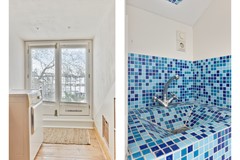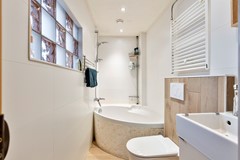 Achter de keuken bevindt zich de recent volledig vernieuwde badkamer (2025). Een moderne ruimte met strakke witte wandtegels, een ligbad, toilet, wastafel met meubel en een designradiator. Hier komen stijl en comfort naadloos samen.