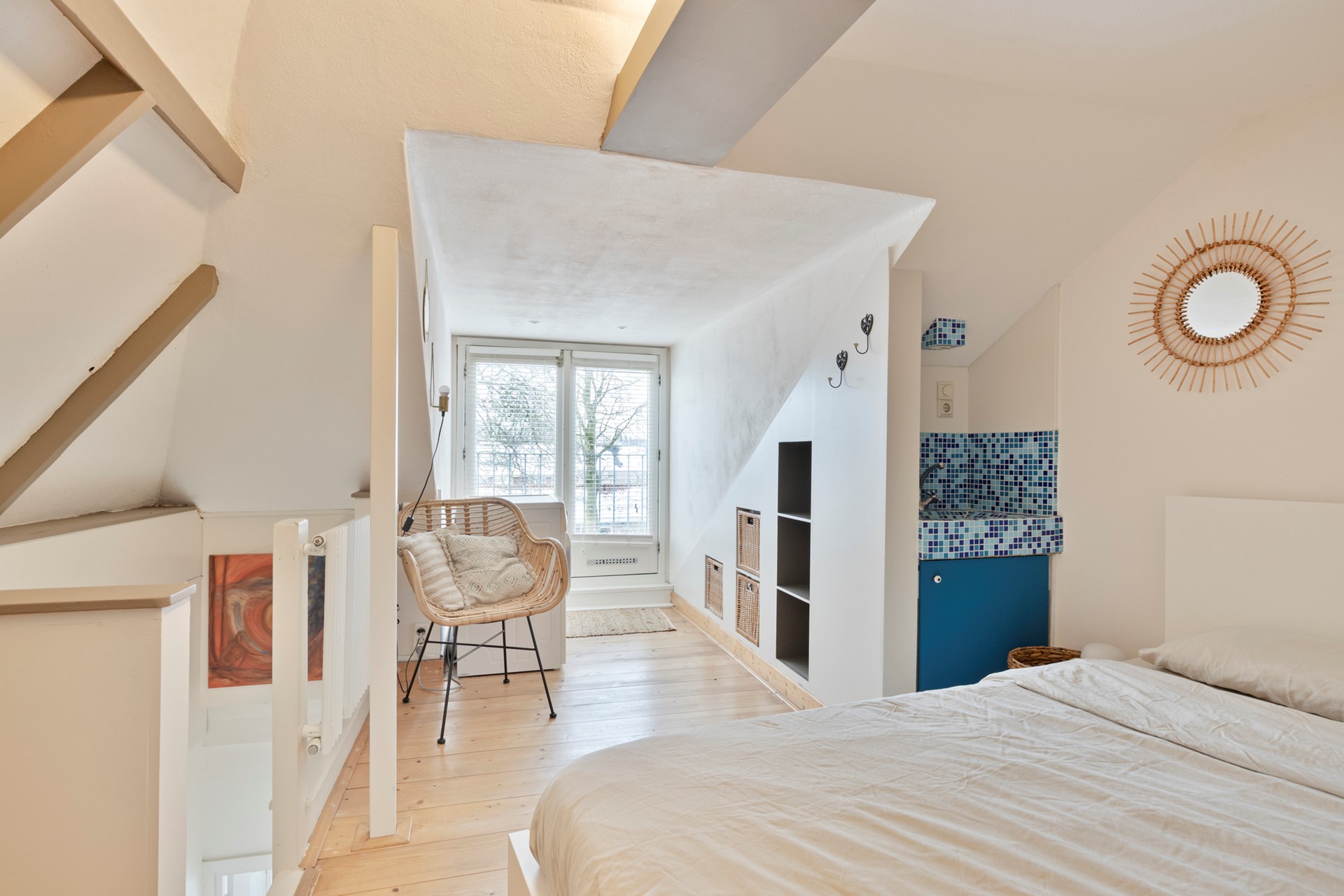 De tweede verdieping biedt een ruime derde slaapkamer met veel opbergruimte, een vaste wastafel en aansluitingen voor wasmachine en droger. Een fijne, multifunctionele ruimte die zich perfect leent als master bedroom, werkruimte of logeerkamer.