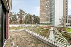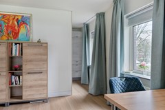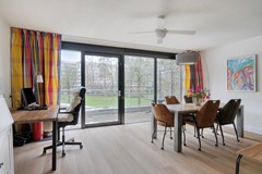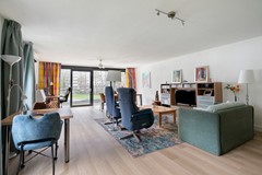 De royale woonkamer is een ware leefruimte waar comfort en sfeer hand in hand gaan. De nieuwe houtlook PVC vloer geeft warmte en rust, terwijl de grote schuifpui het buitenleven naar binnen haalt. Vanuit hier stap je zo het indrukwekkende hoekbalkon van maar liefst 28 m² op – een plek waar je elk seizoen geniet van het groene uitzicht, de stilte en de frisse lucht. Of het nu een kop koffie in de ochtendzon is of een goed glas wijn in de avond, dit balkon voelt als een verlengstuk van je woonkamer. De aanwezige airconditioning zorgt ervoor dat het binnenklimaat ook op warme zomerdagen aangenaam blijft.
