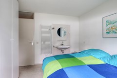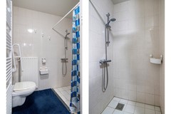 Het appartement beschikt over twee ruime slaapkamers. De hoofdslaapkamer is uitgerust met een eigen wastafel, wat zorgt voor extra comfort. De tweede slaapkamer heeft een royale kastenwand en leent zich uitstekend als logeerkamer, hobbyruimte of werkkamer. De badkamer is centraal gelegen tussen de slaapkamers en ingericht met een wastafel in een stijlvol wandmeubel, een douche en een toilet. Het ligbad is volledig intact; momenteel staan hier de wasmachine en wasdroger opgesteld. Deze kunnen desgewenst eenvoudig worden verplaatst naar de bijkeuken, waar ook de benodigde aansluitingen aanwezig zijn. Vanuit de hal is bovendien een separate toiletruimte bereikbaar met een wandcloset en fonteintje, wat prettig is voor gasten.