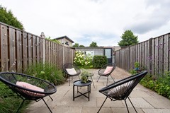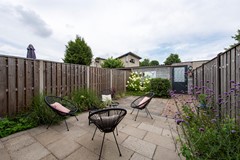De achtertuin is met zorg aangelegd en onderhoudsvriendelijk ingericht met bestrating, borders, een drain voor regenwaterafvoer, en een praktische berging met achterom. De berging is uitgebreid met een overkapping en het dak is professioneel vervangen door een kunststof exemplaar.