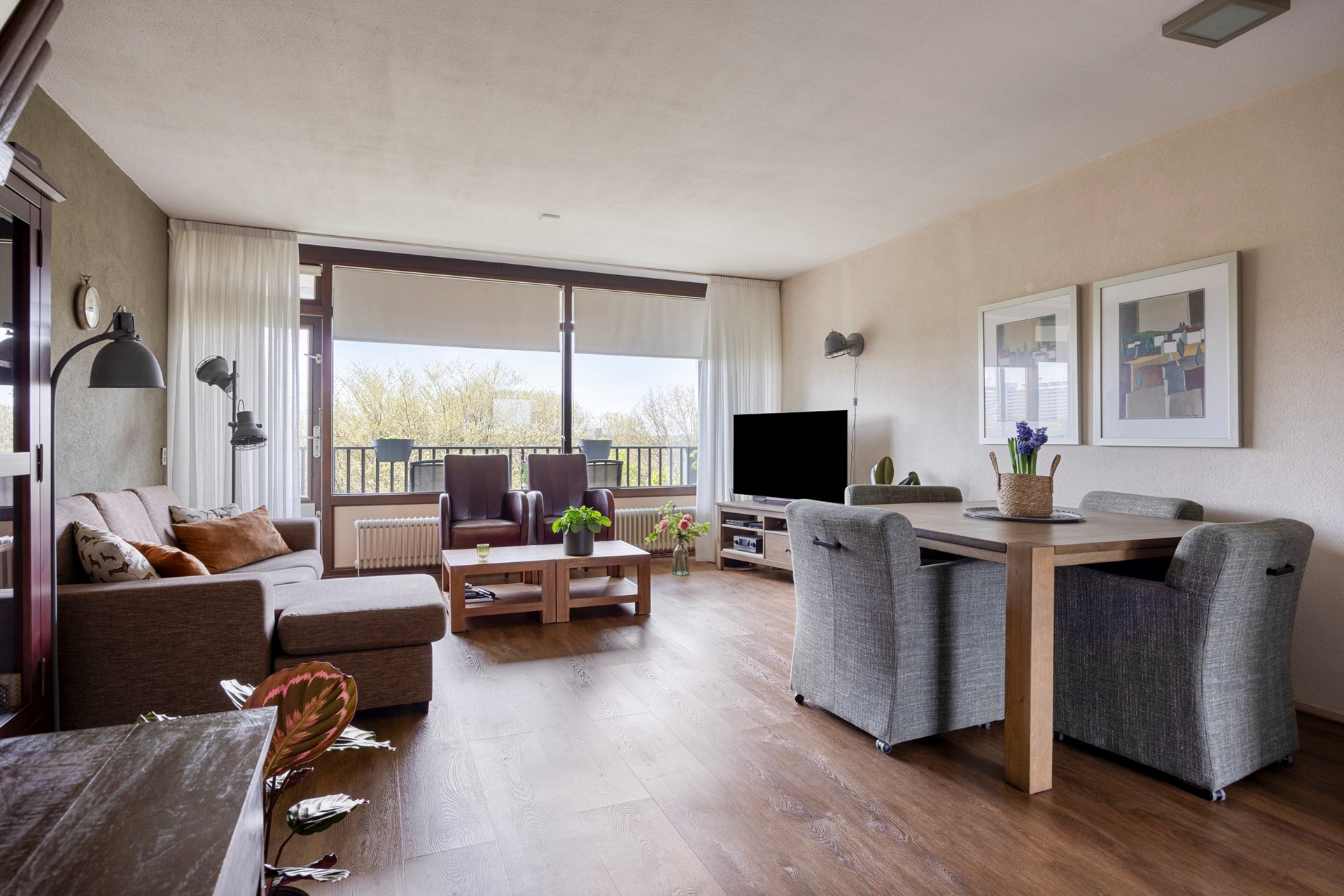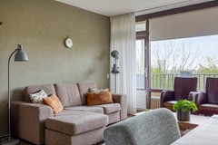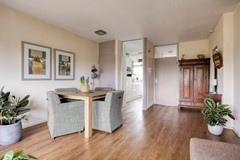 Bij binnenkomst valt direct de warme uitstraling van de houtlook PVC vloer op, die als een stijlvolle basis doorloopt in vrijwel het gehele appartement. De woonkamer vormt het kloppend hart van de woning: royaal, licht en uitnodigend. Dankzij de grote raampartijen over de volledige breedte baadt de ruimte in daglicht en geniet je van een vrij uitzicht dat nooit verveelt. Hier ontstaat moeiteloos een fijne balans tussen ontspanning en gezellig samenzijn, met ruimte voor een comfortabele zithoek én een sfeervolle eethoek.