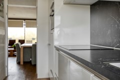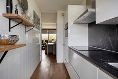 De keuken is functioneel en verzorgd ingericht, met alles wat je nodig hebt binnen handbereik. Het rechte keukenblok met boven- en onderkasten biedt volop bergruimte, terwijl het grote raam zorgt voor een prettige lichtinval tijdens het koken. Of je nu snel iets bereidt of uitgebreid wilt koken, deze keuken ondersteunt elk moment.