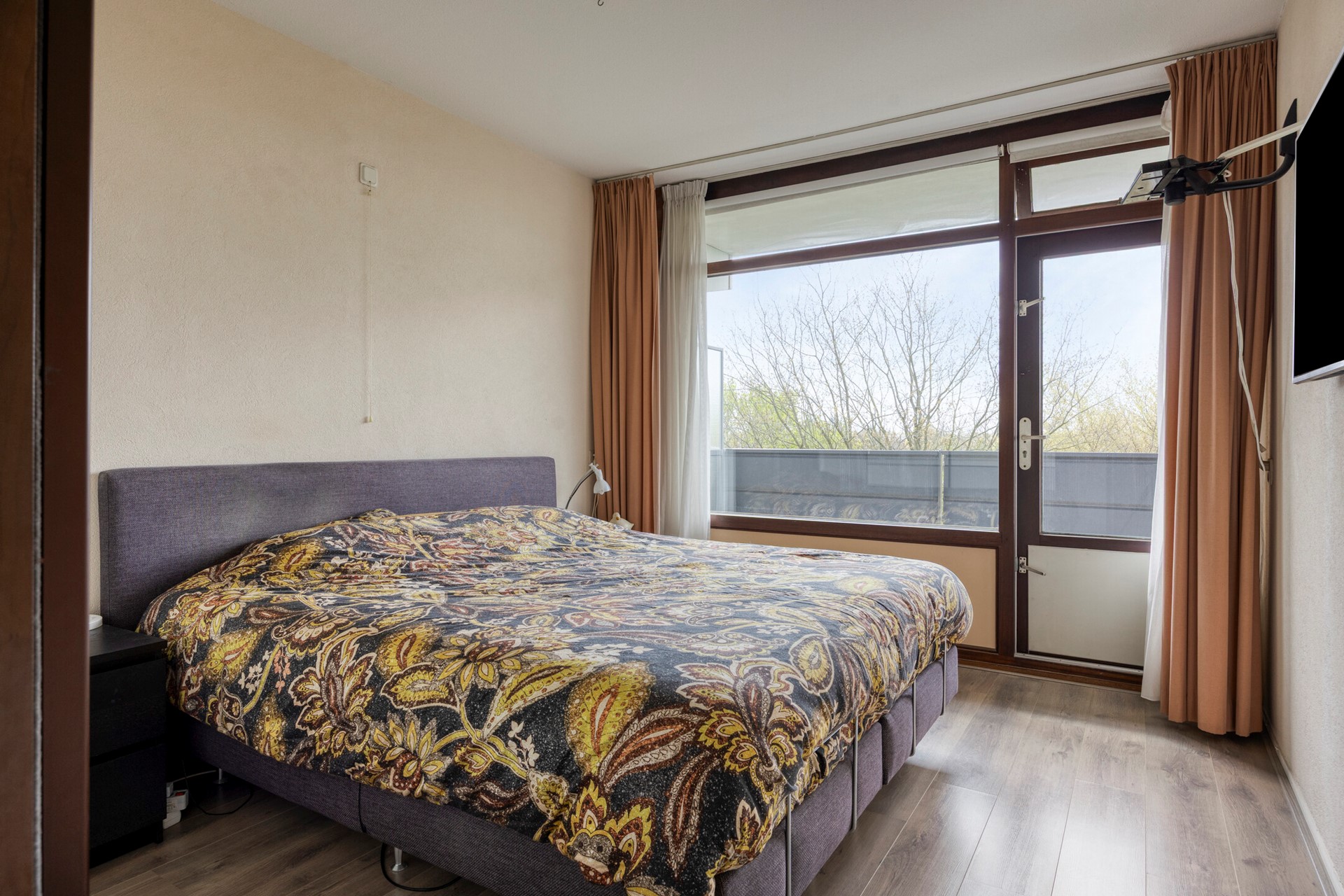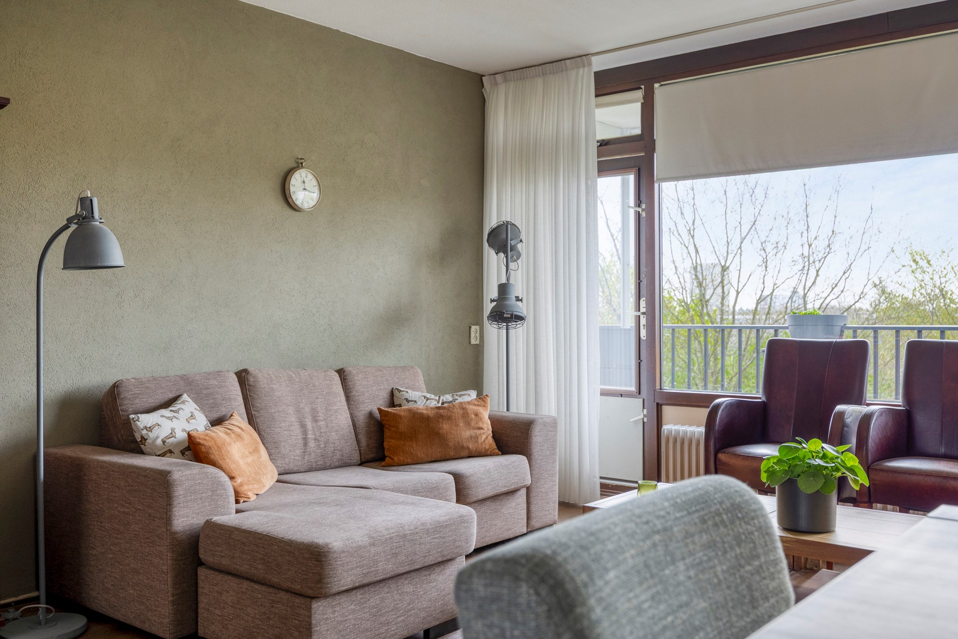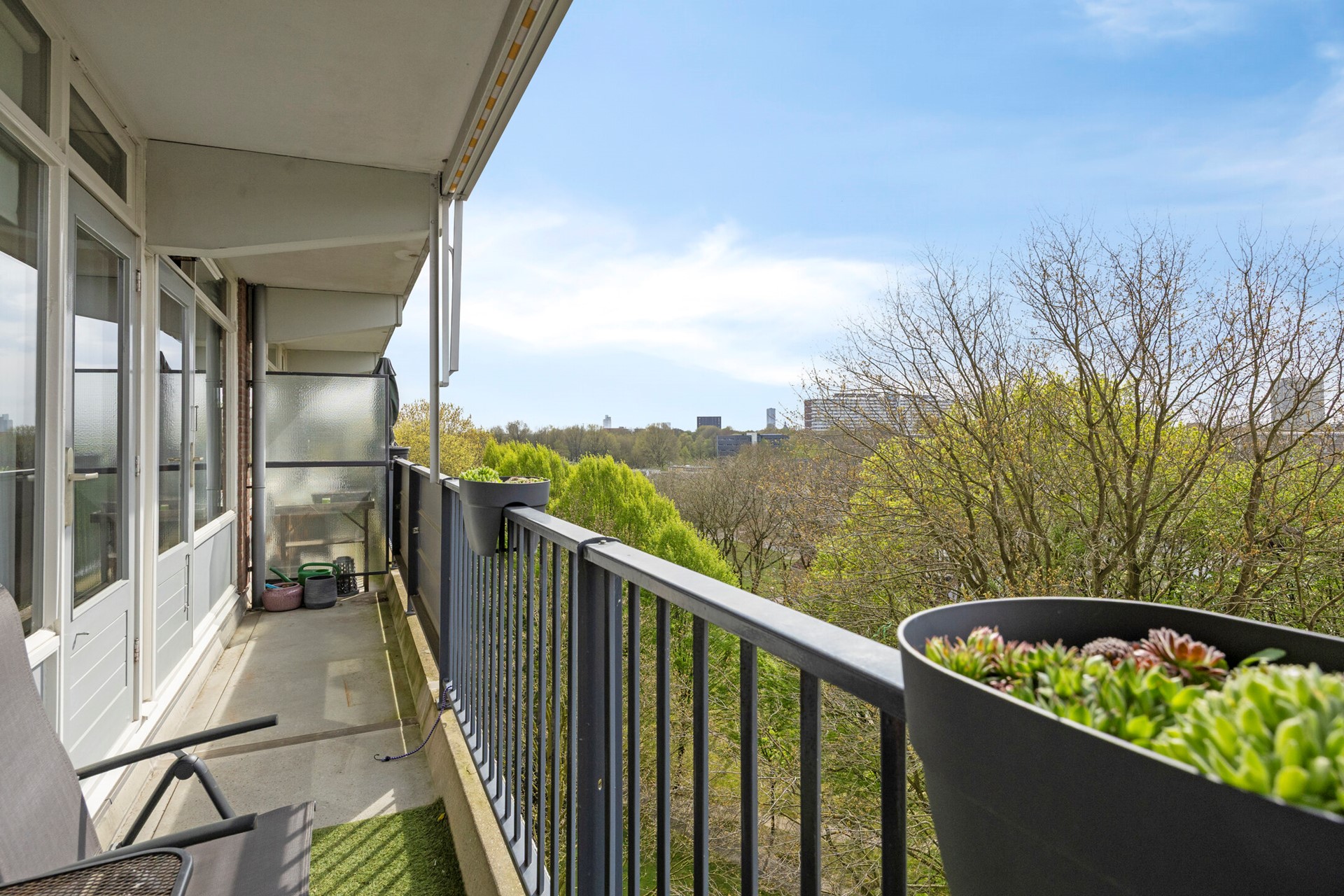 Het balkon, bereikbaar vanuit zowel de woonkamer als de hoofdslaapkamer, strekt zich uit over de volledige breedte van het appartement. Dit is zo’n plek waar je ’s ochtends rustig de dag begint met een kop koffie en ’s avonds de dag afsluit met een goed glas wijn. Het vrije uitzicht zorgt voor een gevoel van ruimte en privacy — een zeldzame combinatie in de stad.