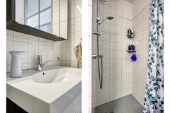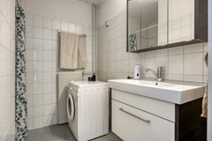 De badkamer is praktisch ingericht en voorzien van een douche, wastafel met ondermeubel en aansluitingen voor wasapparatuur. Een ruimte die doet wat hij moet doen, overzichtelijk en comfortabel.