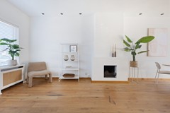 Via de entree stap je binnen in de woonkamer, waar direct de authentieke sfeer voelbaar is. De hoge plafonds geven de ruimte een ruimtelijk gevoel en versterken het karakter van de woning. De sfeervolle haard vormt een warm middelpunt van de kamer en maakt dit een plek waar je graag samenkomt tijdens lange avonden.