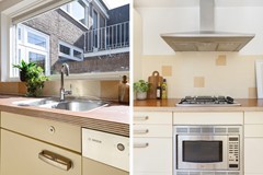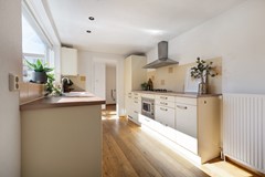 Achter de woonkamer bevindt zich de keuken, een praktische en fijne plek waar koken en samenzijn samenkomen. De keuken is uitgerust met diverse inbouwapparatuur, waaronder een vaatwasser, combimagnetron, 4-pits gaskookplaat, afzuigkap en een koel-/vriescombinatie.
