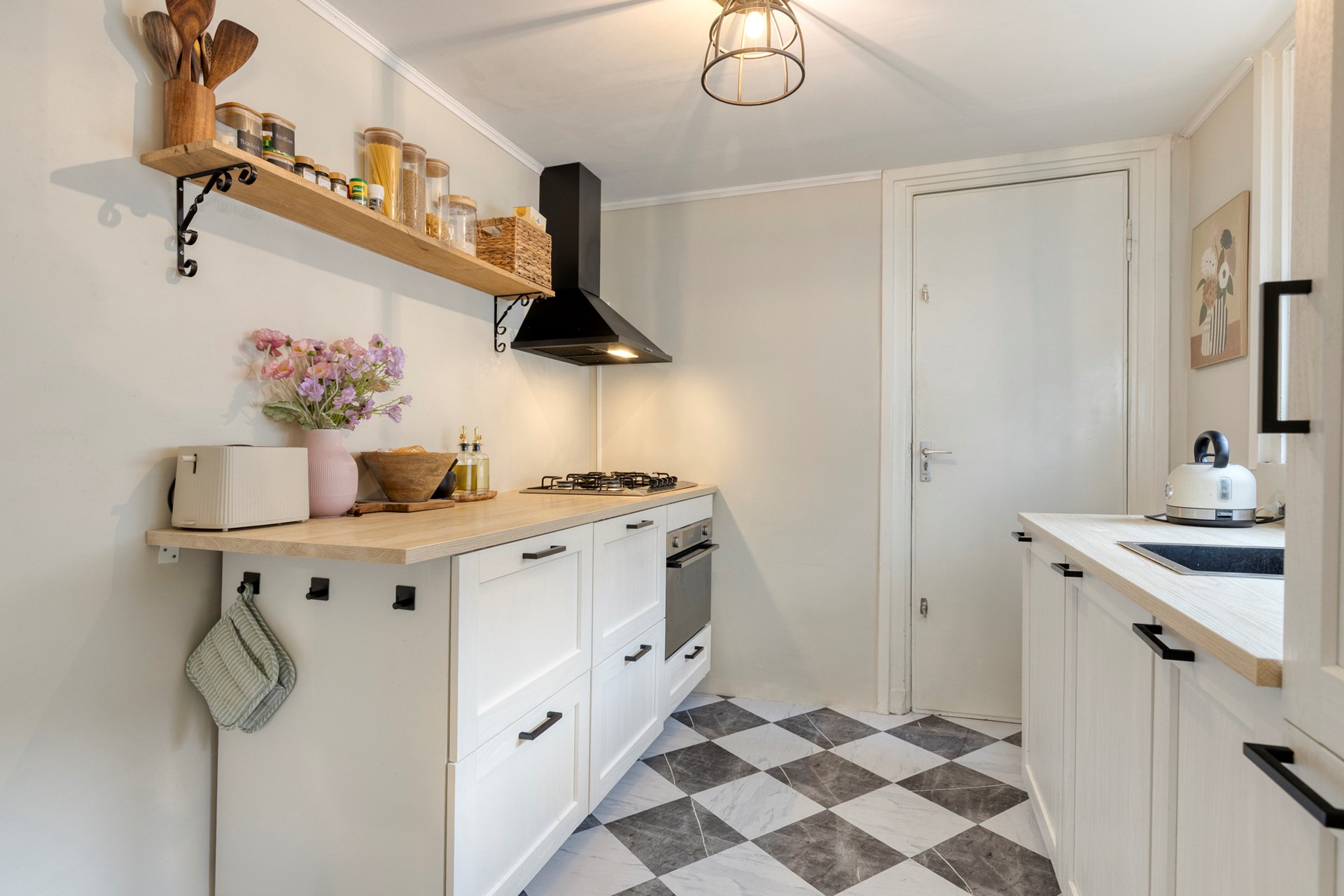 Aan de achterzijde bevindt zich de vernieuwde keuken: modern, fris en heerlijk praktisch. Het aanrecht onder het raam vangt het ochtendlicht, terwijl je aan de overkant kookt op de 5-pits gaskookplaat onder een stoere zwarte afzuigkap. De brede combi-oven staat klaar voor jouw culinaire experimenten. Extra pluspunt: een inbouwkast waar verrassend veel in past. Hier wordt koken vanzelf een feestje.